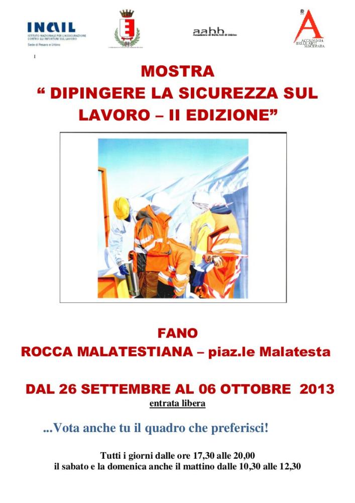 Concorsi, Urbino, Fano, 26 September 2013 III° Mostra collettiva dei finalisti Premio Pittura INAIL -Dipingere la sicurezza sul lavoro- dal 26/09 al 6/10/2013 Rocca Malatestiana, Fano Inserito 12 anni fa 1 Mi piace Non piace più 3 Commenti 86 Visite Condividi Facebook Twitter Google + Commenti 2 12 anni fa Cat Fotografo Compliments ! 12 anni fa emilia rebuglio Artista Congratulazioni! Inserisci commento E' necessario effettuare il login o iscriversi per inserire il commento Login