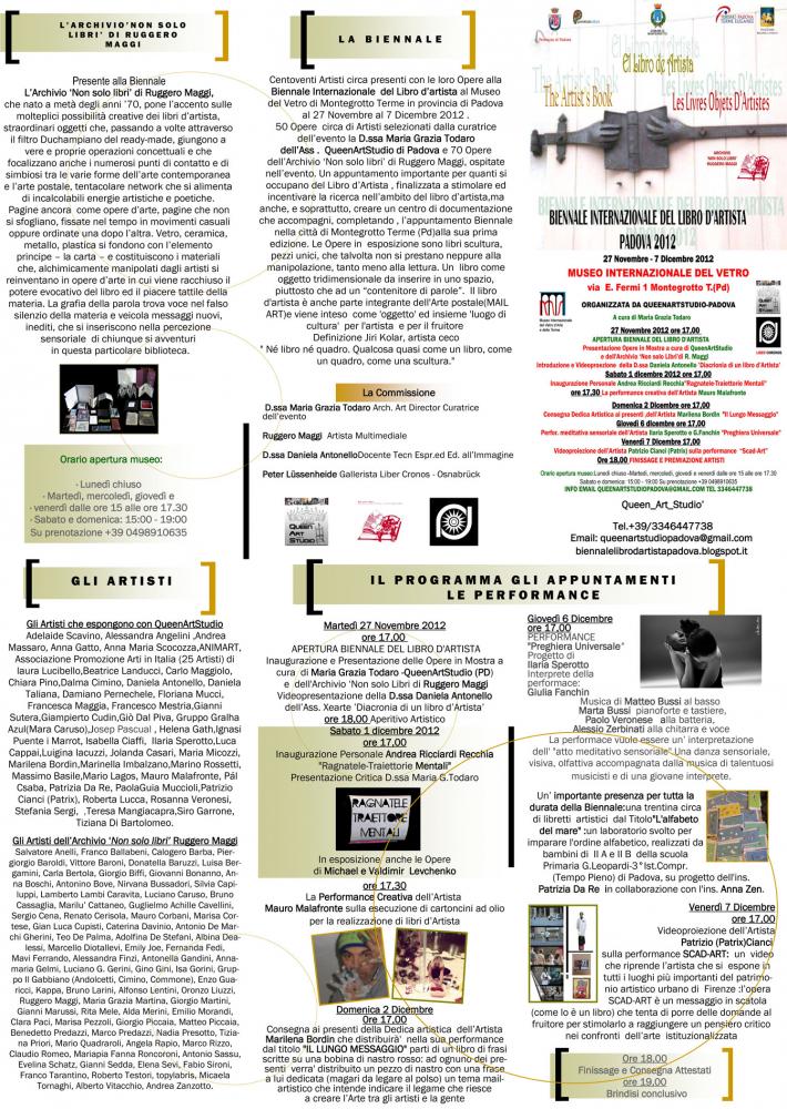 Opere di Artisti selezionati dalla curatrice dell’evento la D.ssa Maria Grazia Todaro e parte dell’Archivio Non solo libri di Ruggero Maggi, ospitate nell’evento. Un appuntamento importante per quanti si occupano del Libro d’Artista , finalizzata a stimolare ed incentivare la ricerca nell’ambito del libro d’artista,ma anche, e soprattutto, creare un centro di documentazione che accompagni, completando , l’appuntamento Biennale nella città di Montegrotto Terme (Pd)alla sua prima edizione. Le Opere in esposizione sono libri scultura, pezzi unici, che talvolta non si prestano neppure alla manipolazione, tanto meno alla lettura. Un libro come oggetto tridimensionale da inserire in uno spazio, piuttosto che ad un “contenitore di parole”. Altri artisti che operano in questo settore cercano invece di riciclare o trasformare libri preesistenti in nuove espressioni d'arte. In questo modo, il libro si separa dal fine per cui era stato pubblicato ma mantiene le sue caratteristiche fisiche ed estetiche, diventando la cornice per nuove idee e nuove immagini. In editoria troviamo piuttosto 'pezzi unici', o numerati in serie limitate a pochissimi esemplari, realizzati con tecniche miste tra le quali primeggia il collage che si alterna a parti stampate con caratteri tipografici ed a pagine, o frammenti di esse, tratte dalla quotidianità e dal mondo della pubblicità. Il libro d'artista è anche parte integrante dell'Arte postale MAIL ART e viene inteso come 'oggetto' ed insieme 'luogo di cultura' per l'artista e per il fruitore Dalla Definizione Jiri Kolar, artista ceco" Né libro né quadro. Qualcosa quasi come un libro, come un quadro, come una scultura." Numerosi gli eventi correlati alla Biennale. Un calendario ricco di appuntamenti culturali e artistici : Dall’Inaugurazione che vedrà la videopresentazione della D.ssa Daniela Antonello ’Diacronia di un libro d’Artista’ alla Personale di Pittura di Andrea Ricciardi Recchia "Ragnatele-Traiettorie Mentali" correlata alla Mostra,alla esposizione delle degli Artisti Ucraini Michael e Vladimir Levchenko,e ancora la performance dell’ Artista Patrizio Cianci (Patrix) SCAD-ART ,che illustrerà un video che lo riprende mentre si espone in tutti i luoghi più importanti del patrimonio artistico urbano di Firenze; la Performance Creativa dell’Artista Mauro Malafronte sull’esecuzione di cartoncini ad olio adatti per la realizzazione di un libro d’artista con inserimento di frasi e poesie e l’intervento Dedica’Il Lungo Messaggio’dell’Artista Marilena Bordin che distribuirà' parti di un libro di frasi scritte su una bobina di nastro rosso ad ognuno dei presenti un tema mail-artistico che intende indicare il legame che riesce a creare l’Arte tra gli artisti e la gente e la performance meditativa sensoriale dell’Artista Ilaria Sperotto "Preghiera Universale" – 2012 con l’ interprete Giulia Fanchin e con la presenza di un gruppo di talentuosi musicisti e la partecipazione diretta del pubblico per una preghiera intesa "universalmente". Un' Importante Presenza per tutta la durata della Biennale:una trentina circa di libretti artistici dal Titolo"L'alfabeto del mare" :un laboratorio svolto per imparare l'ordine alfabetico realizzati da bambini di II A e II B della scuola Primaria G.Leopardi 3° Istituto Comprensivo (Tempo pieno)di Padova, su progetto dell'ins. Patrizia Da Re in collaborazione con l'ins. Anna Zen. I libri più interessanti approderanno in un secondo momento in Germania presso la galleria Altstädter Bücherstuben (KünstlerBücherSchrank) e nelle vetrine della Casa Delle Fondazioni In Osnabrück di Peter Lüssenheide in Germania http://www.chronosroma.eu/ La Commissione : D.ssa Maria Grazia Todaro Arch. Art Director Curatrice dell’evento Ruggero Maggi Artista Multimediale