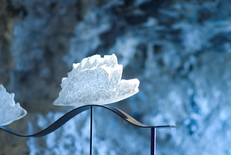 La mostra, dedicata a Thalassa, personificazione del Mediterraneo e madre di tutte le creature marine, si compone di una quindicina di opere, tra le sculture di Elisa Corsini, fatte di metallo e onice della Turchia, alabastro e pietre dell’Altissimo, i dipinti di Francesco Martera, in cui si sovrappongono sabbie e colori acrilici, e le fotografie di Pierluigi Sgarbi, che sembrano avvicinarsi sempre di più al monocromo, per dare corpo al tempo.