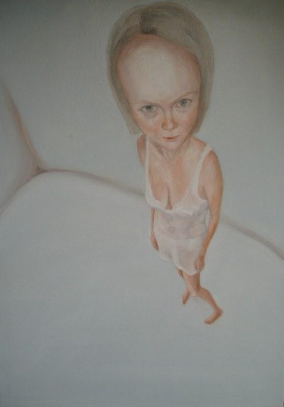 La mostra, intitolata "Chiudi gli occhi", comprenderà un grande dipinto su tela ed una raccolta di opere di minore formato: oli e disegni in cui la figura che l'artista aveva studiato per anni subisce una lieve deformazione, adattandosi allo spazio claustrofobico che la circonda. La testa si ingrandisce, il corpo si ritrae e il collo si allunga, mentre i palloncini d'argento e gli altri elementi che accompagnano la visione si fanno naturale estensione di una figura che mantiene intatta la propria eleganza.