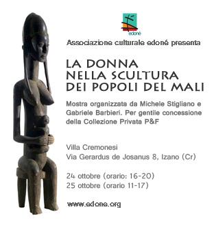 La mostra è dedicata alla donna delle popolazioni tradizionali del Mali (Dogon, Bambara, Senoufo e altre). La figura femminile è qui presentata attraverso un’accurata selezione di statue reperite in Mali da Michele Stigliano in diverse missioni di ricerca e di studio tra il 2004 e il 2009.