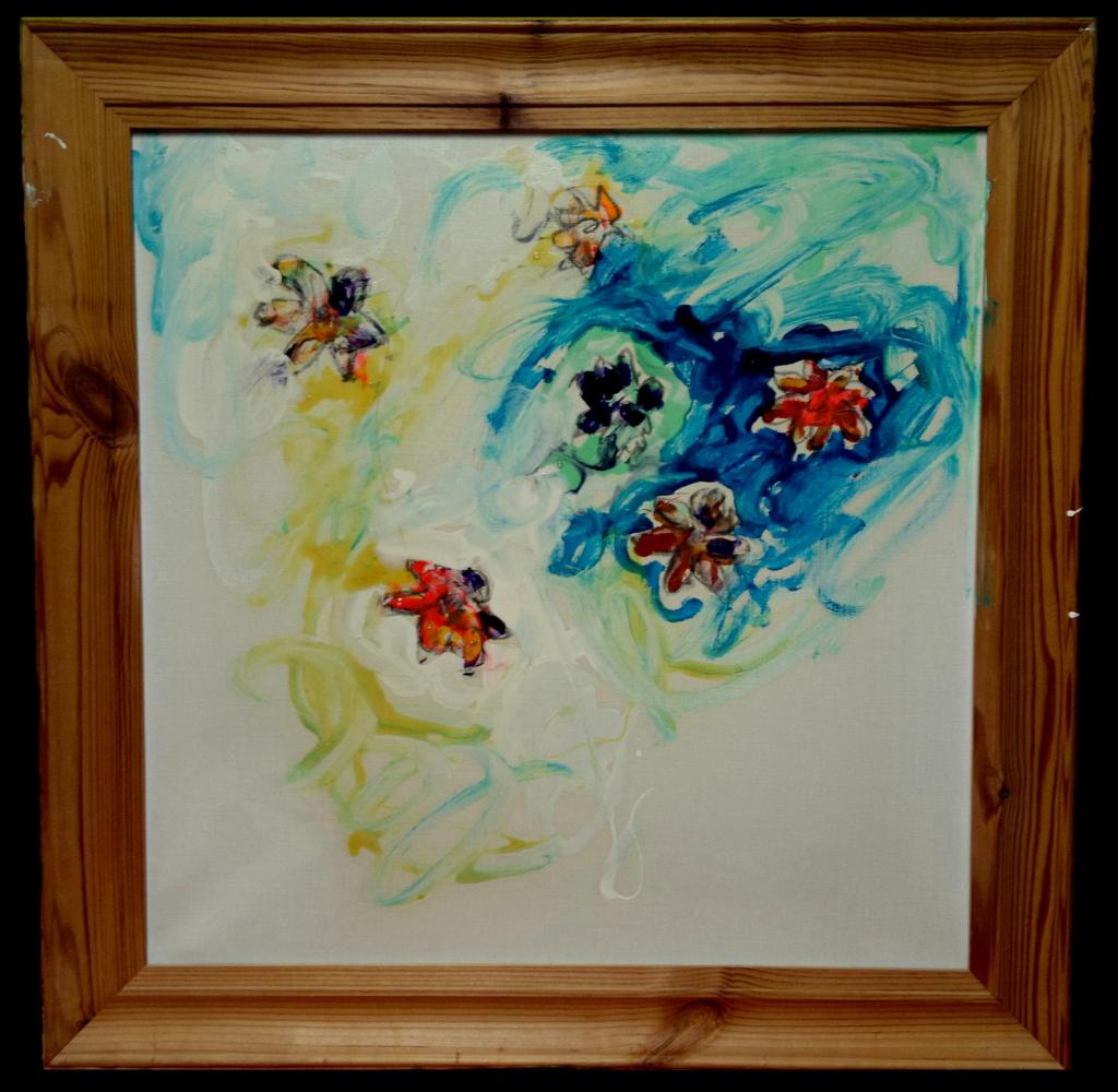 Nell’opera “Colorati” del 1996 (nella foto), appartenente alla fase matura dell’artista, la pronta consapevolezza della visione compositiva offre una fulminea percezione del tutto con i fiori adorni escoriati del colore, il quale turbina intorno in volute ricche di suggestioni e con vigile furore lirico.