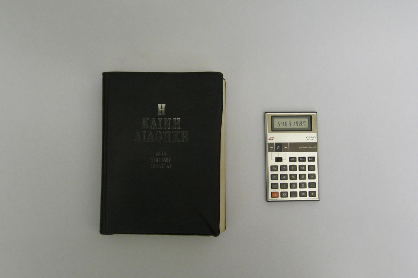 In his videos and installations, Panayiotis Delilabros inhabits current places with fragments of remembered spaces. More recently, his work has reflected the practice of his late father, Constantine Delilabros, a prolific outsider artist, in an attempt at creating a fictional collaboration. For his exhibition at articule, Panayiotis will present Automatic Reproduction of Constantine Delilabros' Music Scores, an installation dealing with Constantine's musical compositions - digital scores based on calculations extracted from the bible and performed on a calculator. The original scores having been destroyed, the artist studied the bible annotated by his father to understand his system and rewrite his music. The scores, transcribed in a font corresponding to Constantine's digitalized handwriting, will be exhibited, and the mathematical equations will be transmitted to a calculator that will play them automatically. The music thus created and amplified in the gallery will be streamed online as well as in the artist's family kitchen in Greece where it originally echoed. With this installation, the artist revisits moments of his childhood both by reproducing the creative deduction of his father and re-contextualising the listening environment of his experimentations - from the kitchen to the gallery space.