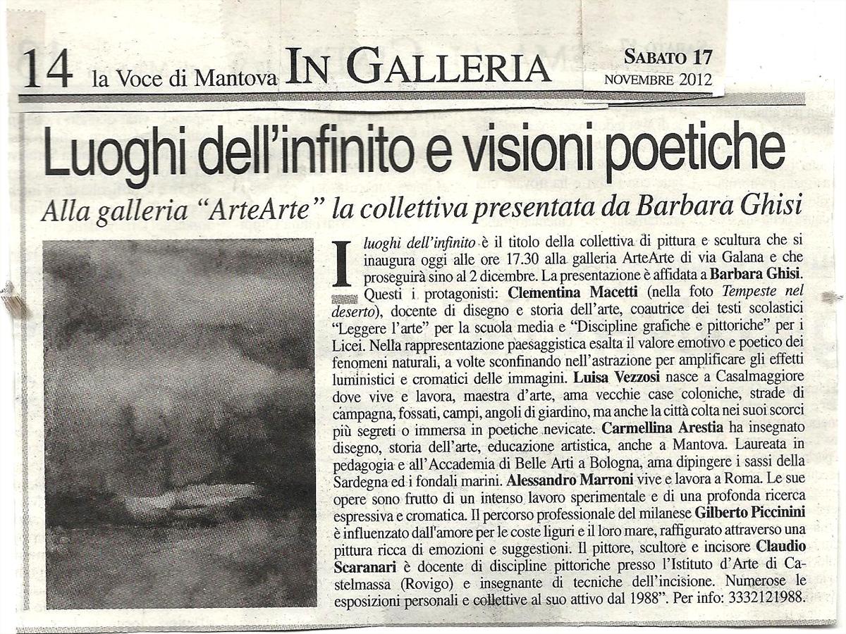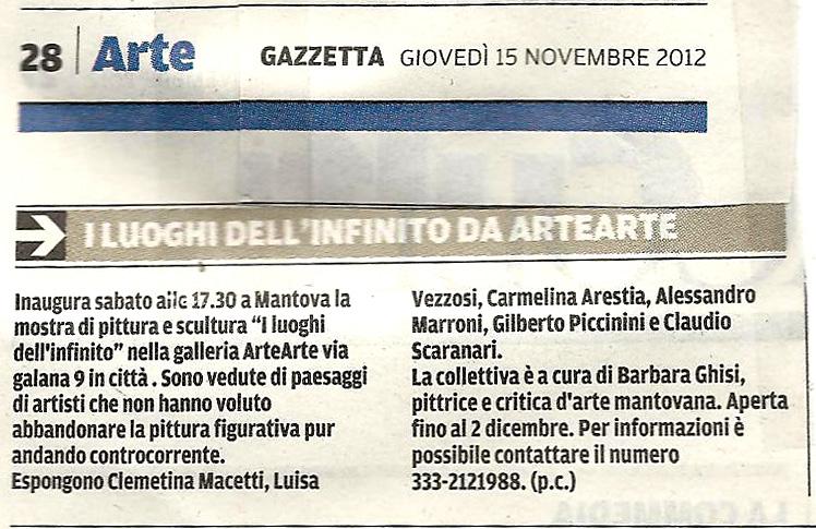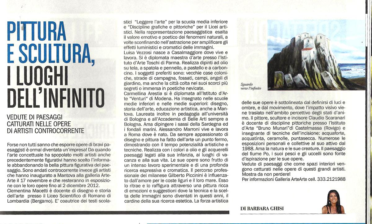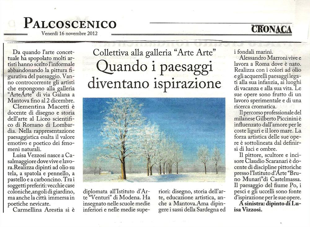 Forse non tutti sanno che esporre opere di bravi paesaggisti è ormai diventata un'impresa! Da quando l'arte concettuale ha spopolato molti artisti anche precedentemente figurativi hanno scelto l'informale abbandonando la bella pittura figurativa del paesaggio. Sono andati controcorrente invece gli artisti che hanno inaugurato a Mantova nella mostra CURATA DA BARBARA GHISI alla galleria ArteArte il 17 novembre e che resteranno in esposizione con le loro opere fino al 2 dicembre 2012.