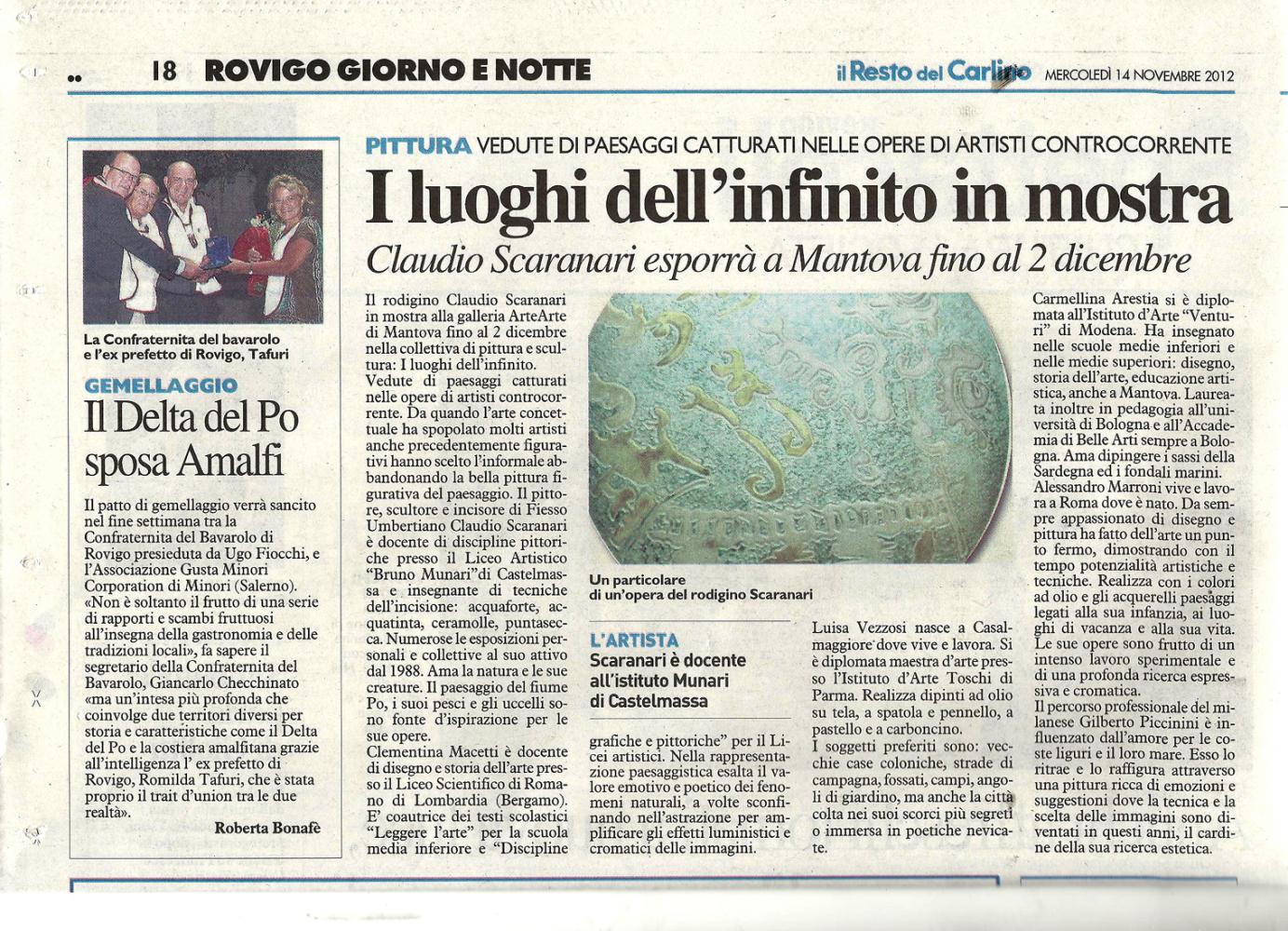 Il pittore, scultore e incisore Claudio Scaranari è docente di discipline pittoriche presso l’Istituto d’Arte “Bruno Munari”di Castelmassa (Rovigo) e insegnante di tecniche dell’incisione: acquaforte, acquatinta, ceramolle, puntasecca. Numerose le esposizioni personali e collettive al suo attivo dal 1988. Ama la natura e le sue creature. Il paesaggio del fiume Po, i suoi pesci e gli uccelli sono fonte d'ispirazione per le sue opere.