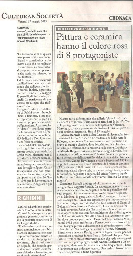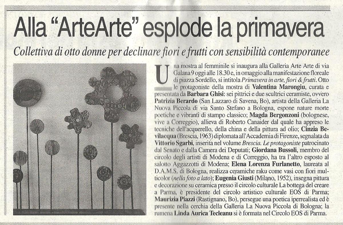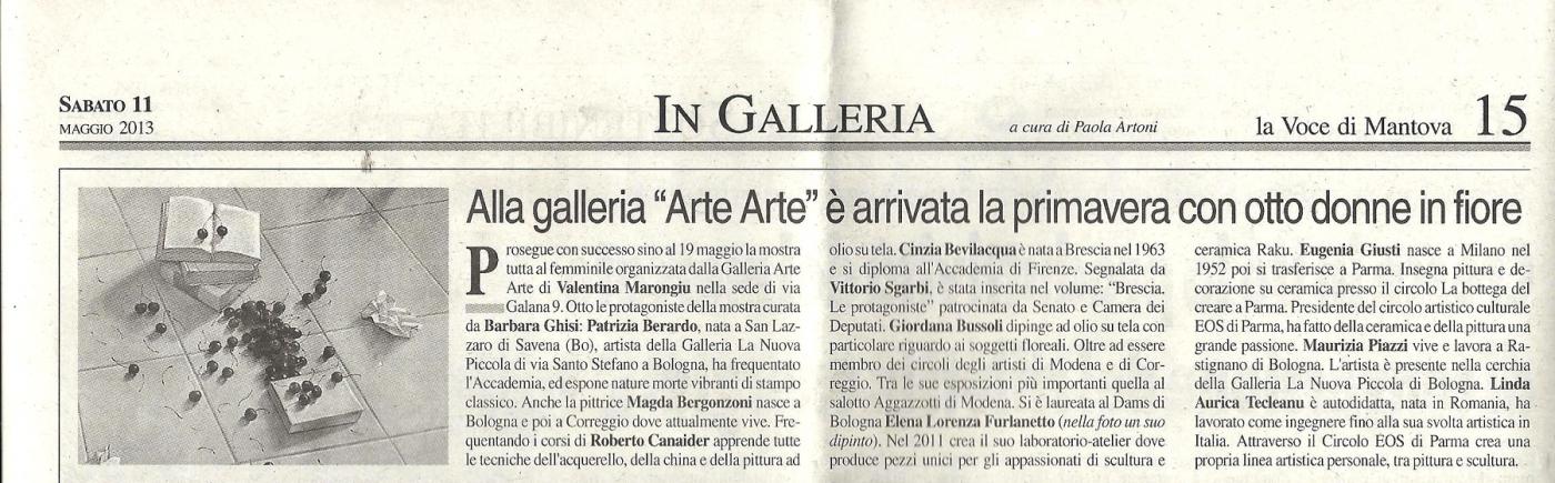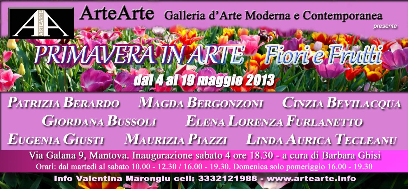 Una mostra tutta al femminile quella che inaugurerà alla Galleria Arte Arte di via Galana 9 a Mantova il 4 maggio. In occasione della manifestazione floreale di piazza Sordello la mostra in Galleria si intitolerà "Primavera in arte, fiori & frutti". Otto le protagoniste della mostra di Valentina Marongiu, curata e presentata da Barbara Ghisi: sei pittrici e due scultrici ceramiste. Patrizia Berardo è nata a San Lazzaro di Savena (Bologna). Artista della Galleria La Nuova Piccola di via Santo Stefano a Bologna, ha frequentato il Liceo Artistico e l'Accademia di Belle Arti di Bologna, ed espone a Mantova nature morte poetiche e vibranti di stampo classico, dove l'eccelsa tecnica pittorica si distingue esaltandone la maestria nelle opere. Anche la pittrice Magda Bergonzoni nasce a Bologna e si trasferisce a Castel Maggiore fino al 2005, poi a Correggio di Reggio Emilia dove attualmente vive e lavora. Frequentando i corsi del maestro Roberto Canaider apprende tutte le tecniche dell'acquerello, della china e della pittura ad olio su tela. Cinzia Bevilacqua è nata a Brescia nel 1963 e dopo la formazione al Liceo Artistico di Brescia si diploma all'Accademia di Belle Arti di Firenze. La sua tecnica preferita è quella ad olio su tela, in memoria degli insegnamenti fiorentini. Segnalata e seguita dal critico Vittorio Sgarbi, la Bevilacqua è stata inserita nel volume: "Brescia Le protagoniste" con il patrocinio del Senato, della Repubblica e della Camera dei Deputati. Giordana Bussoli dipinge ad olio su tela con particolare riguardo ai soggetti floreali. La sua pittura nasce dal cuore e ci regala emozioni impalpabili come le pennellate dei suoi soggetti. Oltre ad essere membro del circolo degli artisti di Modena, fa parte del circolo di Correggio e di numerose associazioni. Tra le sue esposizioni più importanti quella al salotto Aggazzotti di Modena. Si è laureata al D.A.M.S. di Bologna Elena Lorenza Furlanetto. Da anni vicina all'arte della ceramica Raku che l'ha condotta alla realizzazione di opere spettacolari come vasi con fiori multicolor che si distinguono per la loro originalità. Nel 2011 crea il suo laboratorio- atelier dove produce pezzi unici per gli appassionati di scultura e ceramica Raku. Eugenia Giusti nasce a Milano nel 1952 poi si trasferisce a Parma dove vive e lavora tuttora. Insegna pittura e decorazione su ceramica presso il circolo culturale La bottega del creare a Parma. Presidente del circolo artistico culturale EOS di Parma, ha fatto della ceramica e della pittura una grande passione, suo scopo di vita. Maurizia Piazzi vive e lavora a Rastignano di Bologna. La sua poetica iperrealista si traduce in una frase di Edward Hopper: "Un pittore rivela sè stesso attraverso quello che vede nei soggetti che osserva e poi dipinge". L'artista è presente nella cerchia della Galleria La Nuova Piccola di Bologna e le sue opere sembrano fotografie appena scattate di una natura silente. Linda Aurica Tecleanu è un'artista autodidatta nata in Romania cha ha frequentato il liceo e l'università con indirizzo tecnico. Ha lavorato come ingegnere fino alla sua svolta artistica in Italia. Attraverso il Circolo EOS di Parma si libera delle limitazioni imposte dal suo regime e finalmente crea una propria linea artistica personale, tra pittura e scultura. Una serie di bassorilievi materici e pittorici a tema figurativo.