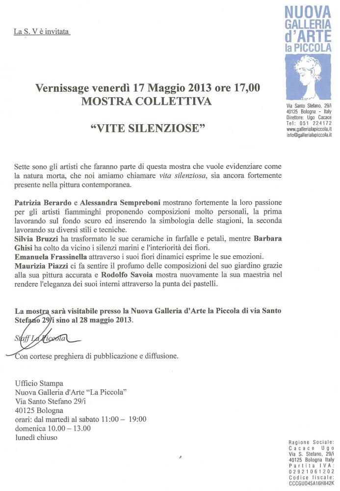 La mostra sarà visitabile presso la Nuova Galleria d'Arte la Piccola di via Santo Stefano 29/i sino al 28 maggio 2013.