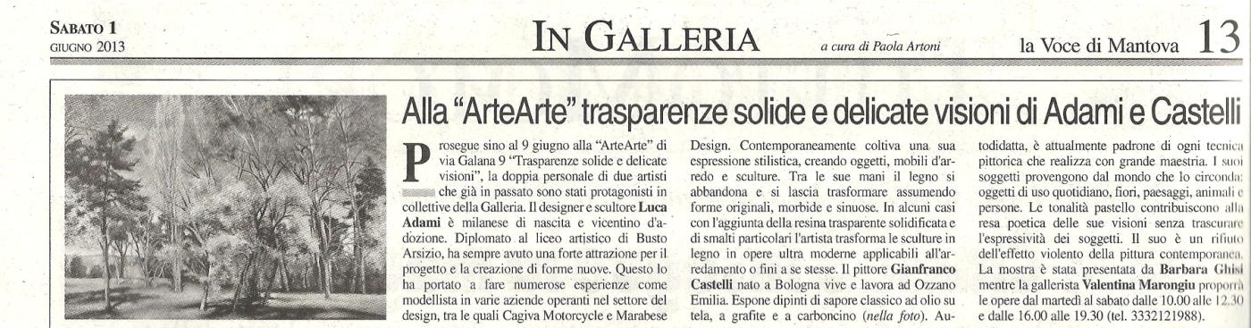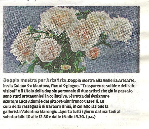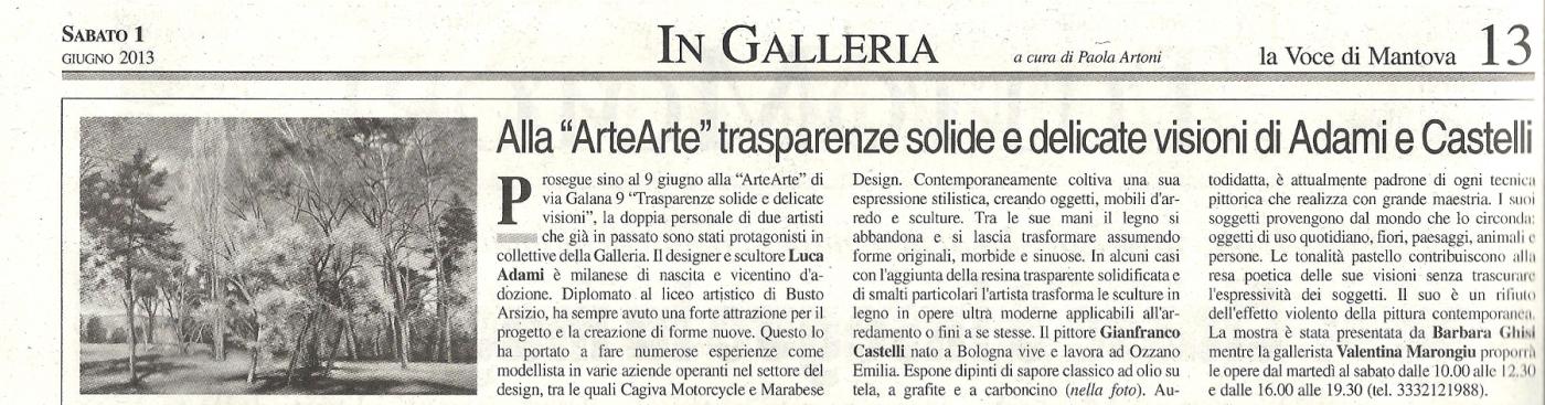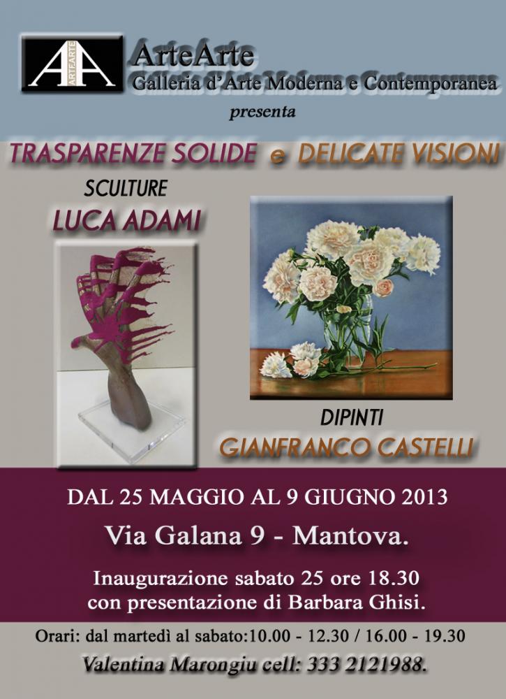 "Trasparenze solide e delicate visioni" è il titolo della doppia personale di due artisti che già in passato sono stati protagonisti in collettive della Galleria d'Arte Moderna e Contemporanea di via Galana 9, in centro storico a Mantova. Il designer e scultore Luca Adami è milanese di nascita e vicentino d'adozione. Diplomato al liceo artistico di Busto Arsizio (Varese), ha sempre avuto una forte attrazione per il progetto e la creazione di forme nuove. Questo lo ha portato a fare numerose esperienze come modellista in varie aziende operanti nel settore del design, tra le quali Cagiva Motorcycle e Marabese Design. Contemporaneamente coltiva una sua espressione stilistica, creando oggetti, mobili d'arredo e sculture in legno. Tra le sue mani il legno si abbandona e si lascia trasformare assumendo forme originali, morbide e sinuose. In alcuni casi con l'aggiunta della resina trasparente solidificata e di smalti particolari l'artista trasforma le sculture in legno in opere ultra moderne applicabili all'arredamento o fini a se stesse. Il pittore Gianfranco Castelli nato a Bologna vive e lavora ad Ozzano Emilia. Espone dipinti di sapore classico ad olio su tela, a grafite e a carboncino. Autodidatta, spinto ad imparare dalla passione per la pittura classica è attualmente padrone di ogni tecnica pittorica che realizza con grande maestria. I suoi soggetti provengono dal mondo che lo circonda: oggetti di uso quotidiano, fiori, paesaggi, animali e persone. Tutto ciò che il suo occhio curioso e indagatore coglie e cattura. Ogni sua opera è carica di serenità e pathos senza colori violenti. Le tonalità pastello contribuiscono alla resa poetica delle sue visioni senza trascurare l'espressività dei soggetti. Il suo è un rifiuto dell'effetto violento della pittura contemporanea, in virtù di un sentire tutto personale. L'inaugurazione si terrà alle ore 18.30 di sabato 25 maggio con presentazione di Barbara Ghisi. La gallerista Valentina Marongiu proporrà le opere al pubblico tutti i giorni dal martedì al sabato dalle 10.00 alle 12.30 e dalle 16.00 alle 19.30. Fino al 9 giugno. Da non perdere!