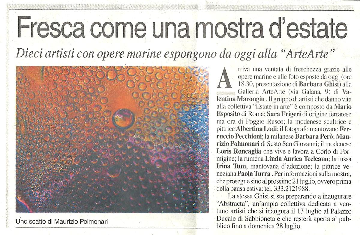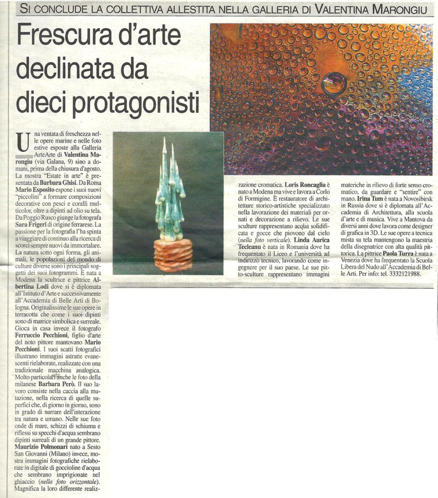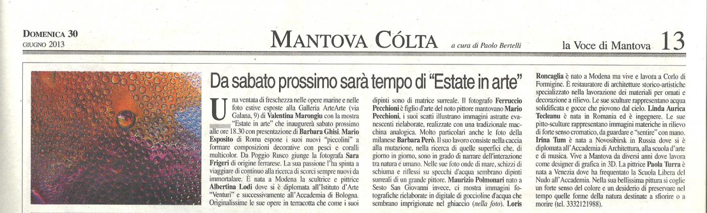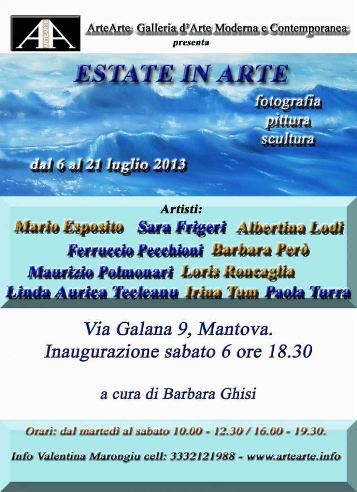 Una ventata di freschezza nelle opere marine e nelle foto estive esposte a Mantova alla Galleria ArteArte di Valentina Marongiu dal 6 al 21 luglio, prima della chiusura d'agosto. La mostra "Estate in arte" inaugurerà nella sede al civico 9 di via Galana alle ore 18.30 di sabato 6, con presentazione di Barbara Ghisi. Pittori, fotografi e scultori provenienti dall’Italia e dall’estero porteranno nella città virgiliana l'atmosfera delle loro visioni estive. Da Roma Mario Esposito torna in galleria reduce dalla precedente mostra "Regal-Arte". Espone i suoi nuovi "piccolini" a formare composizioni decorative con pesci e coralli multicolor, oltre a dipinti ad olio su tela. Da Poggio Rusco nel mantovano giunge la fotografa Sara Frigeri di origine ferrarese. La passione per la fotografia l’ha spinta a viaggiare di continuo alla ricerca di scorci sempre nuovi da immortalare. La natura sotto ogni forma, gli animali, le popolazioni del mondo di culture diverse sono i principali soggetti dei suoi fotogrammi. E’ nata a Modena la scultrice e pittrice Albertina Lodi dove si è diplomata all’Istituto d’Arte “Venturi” e successivamente all’Accademia di Belle Arti di Bologna. Originalissime le sue opere in terracotta che come i suoi dipinti sono di matrice simbolica e surreale. Gioca in casa invece il fotografo Ferruccio Pecchioni, figlio d'arte del noto pittore mantovano Mario Pecchioni. I suoi scatti fotografici illustrano immagini astratte evanescenti rielaborate, realizzate con una tradizionale macchina analogica. Molto particolari anche le foto della milanese Barbara Però. Il suo lavoro consiste nella caccia alla mutazione, nella ricerca di quelle superfici che, di giorno in giorno, sono in grado di narrare dell'interazione tra natura e umano. Nelle sue foto onde di mare, schizzi di schiuma e riflessi su specchi d'acqua sembrano dipinti surreali di un grande pittore. Maurizio Polmonari nato a Sesto San Giovanni (Milano) invece, ci mostra immagini fotografiche rielaborate in digitale di goccioline d'acqua che sembrano imprigionate nel ghiaccio. Magnifica la loro differente realizzazione cromatica. Loris Roncaglia è nato a Modena ma vive e lavora a Corlo di Formigine. E’ restauratore di architetture storico-artistiche specializzato nella lavorazione dei materiali per ornati e decorazione a rilievo. Ha iniziato a manipolare la terracotta nel 1989 al corso del prof. Giovanni Ferrari di Pavullo. Le sue sculture rappresentano acqua solidificata e gocce che piovono dal cielo. Linda Aurica Tecleanu è nata in Romania dove ha frequentato il Liceo e l’università ad indirizzo tecnico, lavorando come ingegnere per il suo paese. E’ autodidatta per passione dell’arte. Le sue pitto-sculture rappresentano immagini materiche in rilievo di forte senso cromatico, da guardare e “sentire” con mano. Irina Tum è nata a Novosibirsk in Russia dove si è diplomata all’Accademia di Architettura, alla scuola d’arte e di musica. Vive a Mantova da diversi anni dove lavora come disigner di grafica in 3D. Le sue opere a tecnica mista su tela mantengono la maestria della disegnatrice con alta qualità pittorica. La pittrice Paola Turra è nata a Venezia dove ha frequentato la Scuola Libera del Nudo all’Accademia di Belle Arti e i corsi di tecniche pittoriche e grafiche tenuti dal prof. Francesco De Notaristefani. Nella sua bellissima pittura si coglie un forte senso del colore e un desiderio di preservare nel tempo quelle forme della natura destinate a sfiorire o a morire. Mostra da non perdere! Info tel.3288662152.