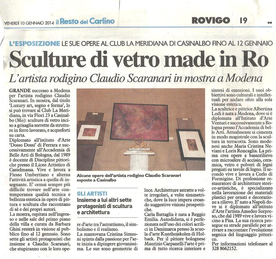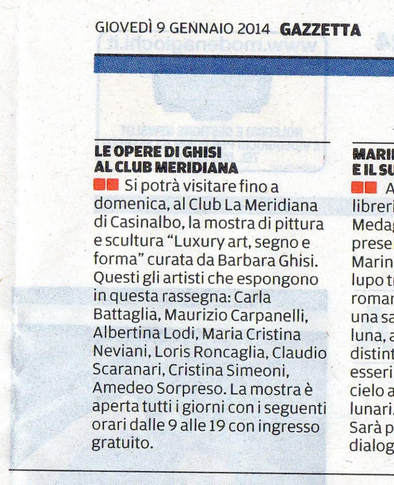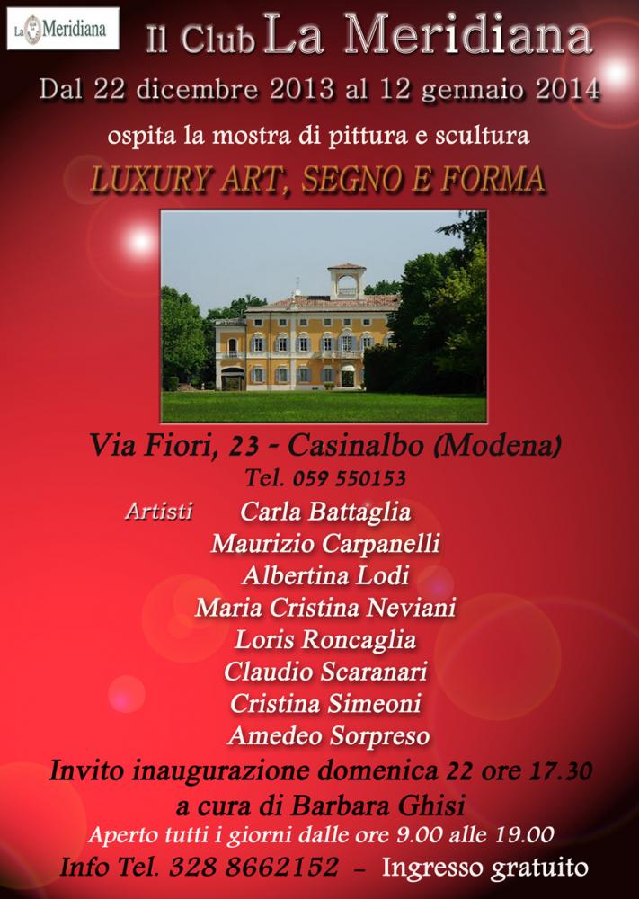 E' ormai sempre più difficile trovare nell'arte contemporanea qualità tecnica e bellezza estetica in opere di pittura e scultura che raccontano di sè e dei propri autori. Nella mostra "Luxury art, segno e forma" che inaugurerà domenica 22 dicembre alle ore 17.00 al Club La Meridiana, in via Fiori 23 a Casinalbo (Modena) tutto questo c'è! Ospitata nell'ingresso e nelle sale del primo piano della villa e curata da Barbara Ghisi resterà in visione al pubblico per tutte le festività natalizie, fino al 12 gennaio 2014. Sono otto gli artisti protagonisti che stupiranno con le loro opere d'arte tra l'astrattismo, il simbolismo e il realismo. Carla Battaglia è nata a Reggio Emilia. Autodidatta, si è perfezionata nell'uso dei colori acrilici in Danimarca presso la scuola d’arte Kunthojskolen di Holbaek. La sua ricerca è tutta imperniata su colori vivi, lucenti e puliti, che hanno per lei un fascino speciale. Il colore dà tensione dinamica alle forme e a volte acquista peso e densità rendendo l’opera potente, a volte sfuma rendendola leggera e vibrante. Per il pittore bolognese Maurizio Carpanelli l'arte è prima di tutto ricerca interiore e sintesi di emozioni. I suoi obbiettivi sono culturali e intellettuali per andare oltre alla sola visione estetica. Le sue ultime sperimentazioni con il colore l’hanno condotto alla tecnica libera del dripping o “gocciolatura” direttamente sulla tela. Per lui il vero fascino della pittura sia figurativa che astratta è nel mistero che trasmette un'immagine. La scultrice e pittrice Albertina Lodi è nata a Modena, dove si è diplomata all'Istituto d'Arte "Venturi" e successivamente a Bologna presso l'Accademia di belle Arti. Ha frequentato un corso di cartoonist ed ha conseguito un master in aerografia con il grande maestro Giorgio Guazzi. Attualmente si cimenta in modo magistrale con la scultura in terracotta, realizzando opere figurative e simboliche che scaturiscono dalla sua fantasia catturando l'anima di chi le osserva. Sono modenesi anche Maria Cristina Neviani e Loris Roncaglia. La prima crea opere a bassorilievo con microsfere di acciaio, ceramica, vetro e polveri di legni pregiati su tavole di legno. La sua è un’arte raffinata formata da linee e colori che sfumano anche nei più piccoli particolari facendo quasi percepire con i suoi giochi di materiali in rilievo i suoni e i profumi dell’opera. Sperimentando è giunta all'utilizzo di superfici irregolari asimmetriche che imprimono maggior movimento all’opera, e di pigmenti che inglobano la luce rilasciandola al buio rendendola luminescente. Il secondo vive e lavora a Corlo di Formigine. Di professione restauratore di architetture storico-artistiche, è specializzato nella lavorazione dei materiali plastici per ornati e decorazione a rilievo. Ha iniziato a lavorare la terracotta nel 1989 seguendo un corso presso lo studio del prof. Giovanni Ferrari di Pavullo. Le sue originalissime sculture solitamente patinate con le tonalità dell’azzurro si distinguono per il senso di leggerezza e trasparenza, insolito per un materiale come la terracotta. Claudio Scaranari è diplomato all'Istituto d'Arte "Dosso Dossi" di Ferrara e successivamente all'Accademia di Belle Arti di Bologna. Dal 1989 è docente di Discipline pittoriche presso l'Istituto di Istruzione Superiore di Castelmassa (Rovigo). Vive e lavora a Fiesso Umbertiano (Ro) ed alterna l'attività artistica a quella di insegnante. In mostra sculture di vetro inciso a grisaglia sorrette da strutture in ferro lavorato, e acqueforti su carta. Mantovana di città l’artista Cristina Simeoni. Spinta dalla passione per l'arte inizia a dipingere giovanissima. Nei primi anni Novanta realizza scenografie per allestimenti en plein air e frequenta corsi di pittura e arti decorative. Nel 2008 ha inaugurato il proprio Studio d’arte con un’esposizione permanente di opere a Piubega (Mn). Le sue sono geometrie di luce. Architetture astratte a volte irregolari, a volte simmetriche, dove la luce impera creando suggestive visioni prospettiche . E' nato a Napoli dove si è diplomato presso l'Istituto d'Arte l'artista Amedeo Sorpreso, che dal 1989 vive e lavora vicino a Pisa. La sua ricerca prosegue su strade parallele per arrivare a raccontare l’evoluzione segnica del linguaggio pittorico. Una curiosità rivolta a tutte le arti applicate e a tutto ciò che possa essere ricollegato all’espressività, come nelle sue personalissime opere della serie "Luminanze". Mostra da vedere! Info tel. 328 8662152.