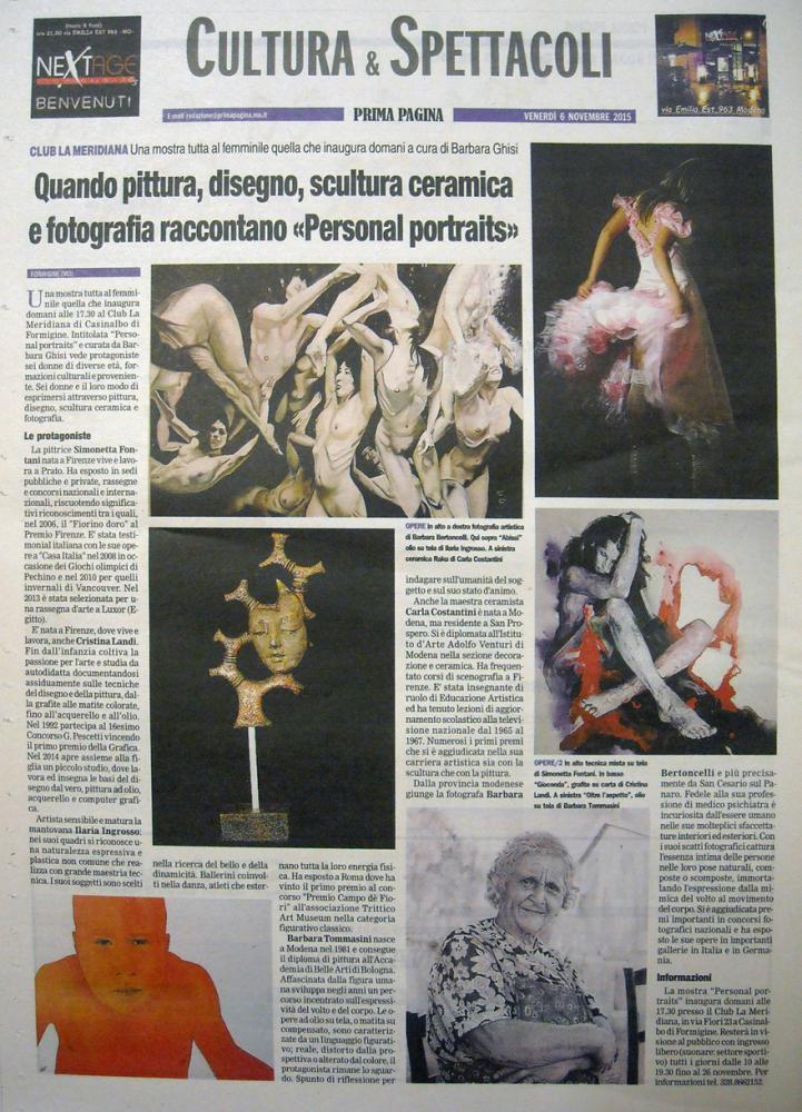 "Personal portraits" è il titolo della mostra di pittura, disegno, scultura ceramica e fotografia che inaugura sabato 7 novembre alle ore 17.30 presso la villa del Club La Meridiana di Casinalbo (Modena) in via Fiori 23. La mostra tutta al femminile curata da Barbara Ghisi, vede come protagoniste sei donne di diverse età, formazioni culturali e provenienze. La pittrice Simonetta Fontani nata a Firenze vive e lavora a Prato. Ha esposto in sedi pubbliche e private, rassegne e concorsi nazionali e internazionali, riscuotendo significativi riconoscimenti tra i quali, nel 2006, il "Fiorino doro" al Premio Firenze. E' stata testimonial italiana con le sue opere a "Casa Italia" nel 2008 in occasione dei Giochi olimpici di Pechino e nel 2010 per quelli invernali di Vancouver. Nel 2013 è stata selezionata per una rassegna d'arte a Luxor (Egitto). E' nata a Firenze anche Cristina Landi, dove vive e lavora. Fin dall’infanzia coltiva la passione per l'arte e studia da autodidatta documentandosi assiduamente sulle tecniche del disegno e della pittura, dalla grafite alle matite colorate, fino all’acquerello e all’olio. Nel 1992 partecipa al 16° Concorso G. Pescetti vincendo il 1° premio della Grafica. Nel 2014 apre assieme alla figlia un piccolo studio, dove lavora ed insegna le basi del disegno dal vero, pittura ad olio, acquerello e computer grafica. Artista sensibile e matura la mantovana Ilaria Ingrosso, nei suoi quadri si riconosce una naturalezza espressiva e plastica non comune che realizza con grande maestria tecnica. I suoi soggetti sono scelti nella ricerca del bello e della dinamicità. Ballerini coinvolti nella danza, atleti che esternano tutta la loro energia fisica. Ha esposto a Roma dove ha vinto il 1° premio al concorso "Premio Campo dè Fiori" all'associazione Trittico Art Museum nella categoria figurativo classico. Barbara Tommasini nasce a Modena nel 1981 e consegue il diploma di pittura all'Accademia di Belle Arti di Bologna. Affascinata dalla figura umana sviluppa negli anni un percorso incentrato sull'espressività del volto e del corpo. Le opere ad olio su tela, o matita su compensato, sono caratterizzate da un linguaggio figurativo; reale, distorto dalla prospettiva o alterato dal colore, il protagonista rimane lo sguardo. Spunto di riflessione per indagare sull'umanità del soggetto e sul suo stato d'animo. Anche la maestra ceramista Carla Costantini è nata a Modena, ma residente a San Prospero. Si è diplomata all'Istituto d’Arte “Adolfo Venturi” di Modena nella sezione decorazione e ceramica. Ha frequentato corsi di scenografia a Firenze. E' stata insegnante di ruolo di Educazione Artistica ed ha tenuto lezioni di aggiornamento scolastico alla televisione nazionale dal 1965 al 1967. Numerosi i primi premi che si è aggiudicata nella sua carriera artistica sia con la scultura che con la pittura. Dalla provincia modenese giunge la fotografa Barbara Bertoncelli e più precisamente da San Cesario sul Panaro. Fedele alla sua professione di medico psichiatra è incuriosita dall'essere umano nelle sue molteplici sfaccettature interiori ed esteriori. Con i suoi scatti fotografici cattura l'essenza intima delle persone nelle loro pose naturali , composte o scomposte, immortalando l'espressione dalla mimica del volto al movimento del corpo. Si è aggiudicata premi importanti in concorsi fotografici nazionali e ha esposto le sue opere in importanti gallerie in Italia e in Germania. La mostra resterà in visione al pubblico con ingresso libero tutti i giorni dalle ore 10.00 alle ore 19.30 (SUONARE campanello settore sportivo) fino al 26 novembre. Per informazioni tel. 328 8662152.
