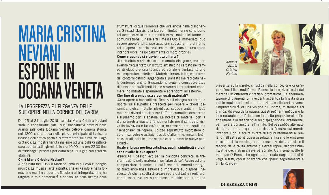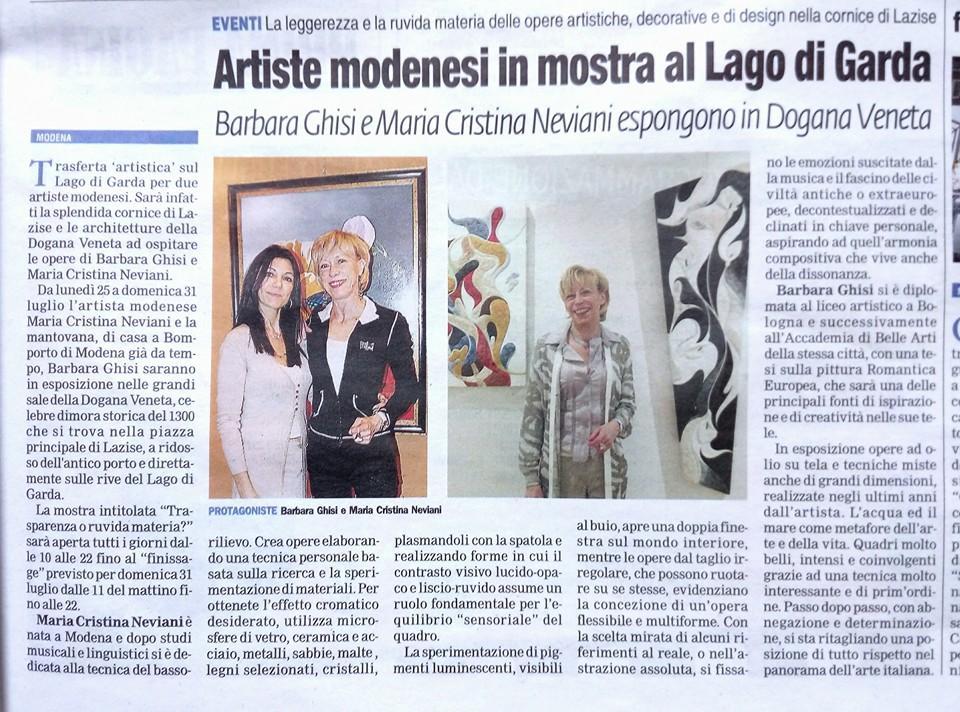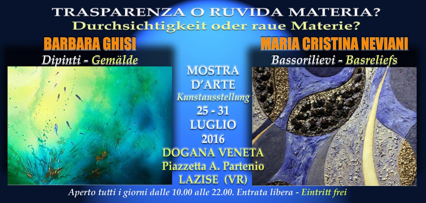 Dal 25 al 31 Luglio 2016 l’artista mantovana Barbara Ghisi e la modenese Maria Cristina Neviani, saranno in esposizione nelle grandi sale della Dogana Veneta celebre dimora storica del 1300 che si trova nella piazza principale di Lazise, a ridosso dell'antico porto e direttamente sulle rive del Lago di Garda. La mostra intitolata “Trasparenza o ruvida materia?” sarà aperta tutti i giorni dalle ore 10.00 alle ore 22.00 fino al “finissage” previsto per domenica 31 luglio dalle ore 11 del mattino fino alle 22. Barbara Ghisi si è diplomata al Liceo Artistico a Bologna e successivamente all’Accademia di Belle Arti della stessa città, con una tesi sulla pittura Romantica Europea, che sarà una delle principali fonti di ispirazione e di creatività nelle sue tele. In esposizione opere ad olio su tela e tecniche miste anche di grandi dimensioni, realizzate negli ultimi anni dall’artista. L’acqua ed il mare come metafore dell’arte e della vita. Quadri molto belli, intensi e coinvolgenti grazie ad una tecnica molto interessante e di prim’ordine. Passo dopo passo, con abnegazione e determinazione, si sta ritagliando una posizione di tutto rispetto nel panorama dell’arte italiana. Maria Cristina Neviani è nata a Modena e dopo studi musicali e linguistici si è dedicata alla tecnica del bassorilievo. Crea opere elaborando una tecnica personale basata sulla ricerca e la sperimentazione di materiali. Per ottenete l’effetto cromatico desiderato, utilizza microsfere di vetro, ceramica e acciaio, metalli, sabbie, malte , legni selezionati, cristalli, plasmandoli con la spatola e realizzando forme in cui il contrasto visivo lucido/opaco e liscio/ruvido assume un ruolo fondamentale per l’equilibrio” sensoriale “ del quadro. La sperimentazione di pigmenti luminescenti, visibili al buio, apre una doppia finestra sul mondo interiore, mentre le opere dal taglio irregolare, che possono ruotare su se stesse, evidenziano la concezione di un’opera flessibile e multiforme. Con la scelta mirata di alcuni riferimenti al reale, o nell’astrazione assoluta, si fissano le emozioni suscitate dalla musica e il fascino delle civiltà antiche o extraeuropee, decontestualizzati e declinati in chiave personale, aspirando ad quell’armonia compositiva che vive anche della dissonanza. Info cell 328 8662152.