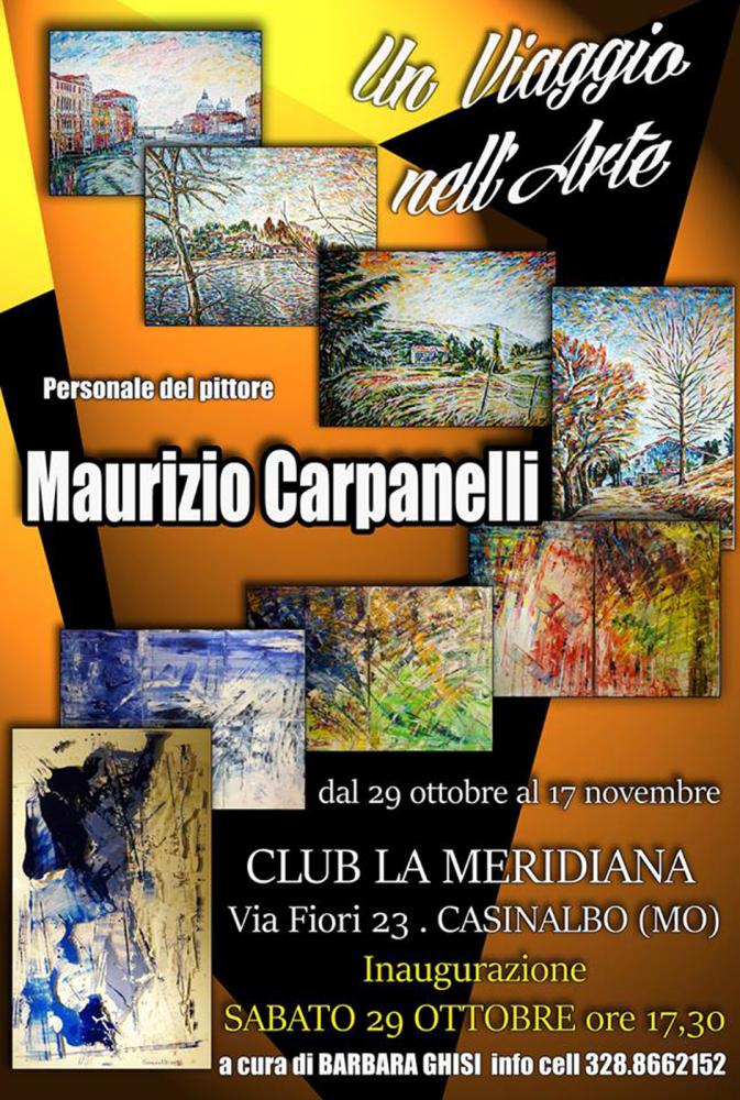 Grande ritorno del pittore Maurizio Carpanelli presso le sale della villa settecentesca del Club La Meridiana di Casinalbo di Modena. Dopo la mostra tenuta con grande successo nell'anno 2000 nella sede di Via Fiori 23, l'artista bolognese torna con tutte le sue opere più contemporanee, senza però tralasciare lo storico figurativo. La mostra Personale dal titolo " Un viaggio nell'Arte" aprirà i battenti ad ingresso libero, Sabato 29 Ottobre alle ore 17.30 alla presenza dell'artista. Presentata e curata da Barbara Ghisi resterà in visione al pubblico tutti i giorni dalle ore 10.00 alle 19.00 fino al 30 Novembre. L'antologica ospita circa 40 dipinti di diverse dimensioni scelti tra quelli più significativi degli anni di attività a partire dai paesaggi figurativi, le immagini femminili e le nature morte, fino agli astratti più contemporanei. La sua pittura ad olio, acrilico, smalti e tecniche miste su tela molto materica e vibrante delinea uno stile personale e inconfondibile, segnato anche dal cromatismo vivace e incisivo. Più trasparente e delicata, ma sempre molto d'impatto visivo, la sperimentazione degli ultimi tempi su plexiglass. Straordinarie alcune vedute di Modena dipinte su plexiglass di grandi dimensioni. La superficie trasparente permette di proiettare l’ombra dell’immagine dipinta, resa grafica dal colore monocromo, sulla parete retrostante creando una seconda opera. In base alla distanza del quadro dal muro a cui è appeso si può ampliare la dimensione dell’ombra, allargando l’effetto finale. Una sfida artistico-intellettuale che Maurizio Carpanelli ha intrapreso per passione dell'arte e che ancora porta avanti.