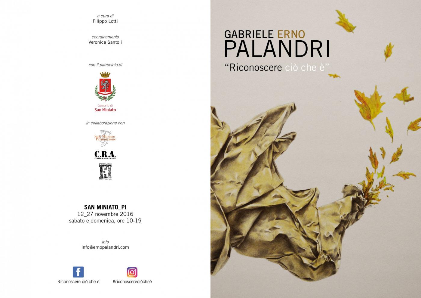 L'esposizione, che vanta il patrocinio del Comune di San Miniato, è realizzata in collaborazione con la Fondazione San Miniato Promozione e con il supporto del C.R.A. – Centro Raccolta Arte; resterà aperta ai visitatori, ad ingresso libero, fino al 27 novembre, il sabato e la domenica dalle 10 alle 19.