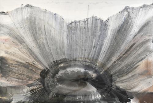 Nella sala principale della galleria, una tela di grande dimensioni dal titolo Terra! (286x420cm. olio su tela 2010) ci appare come se ci trovassimo dinnanzi ad un’immensa voragine, un gigantesco cratere che