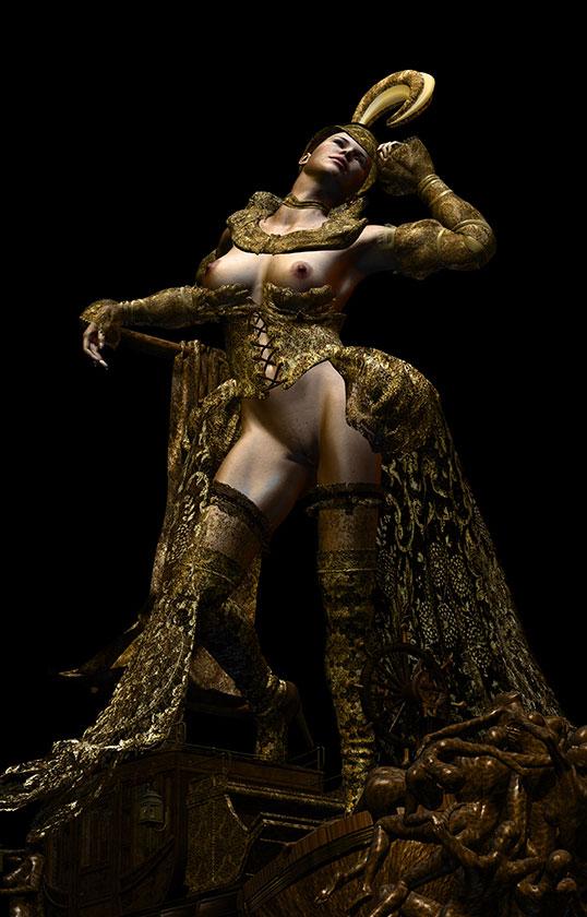 Sono immagini estetizzanti animate da affascinanti entità, sacerdotesse ieratiche, figure alate maschili e femminili adornate da preziosi dettagli dorati. Questi angeli o dei, dal corpo perfetto, circondati da macchine metalliche, troni, carri trionfanti della morte, dalle funzioni misteriose, ci travolgono nel vortice della passione di Eros e Psiche, evocando la potenza immaginifica dell’amore sospeso tra erotismo e misticismo.”.