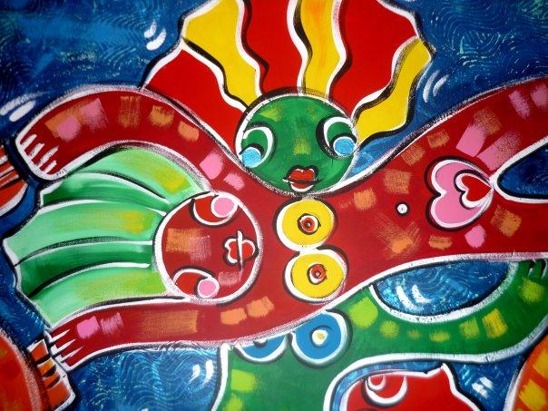 Dipinti come pioggia di colori che spaziano da una tonalità all’altra senza interrompere mai il senso positivo, allegro, comunicatore sulla bellezza della vita e di ogni umana sua espressione.