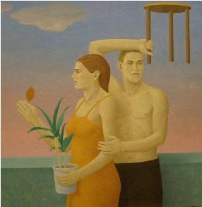 Tutto è misurato, lo spazio come il movimento, e le figure sono presentate come corpi solidi che occupano lo spazio determinandone le proporzioni: lo spazio delle opere di De Gregorio sarebbe quasi unidimensionale senza le figure e gli oggetti (un semplice fondo blu che può rappresentare il mare o un muro) ma la plasticità del corpo di due amanti o l’entrata improvvisa della prua di una barca danno il senso della composizione mostrandone la profondità. Le figure entrano in contatto con gli oggetti dipinti e rendono così misurabile lo spazio. “Esisto dunque sono” sembrano affermare con la loro forte presenza sia l’uomo che la donna che le cose appoggiate sulle mensole.
