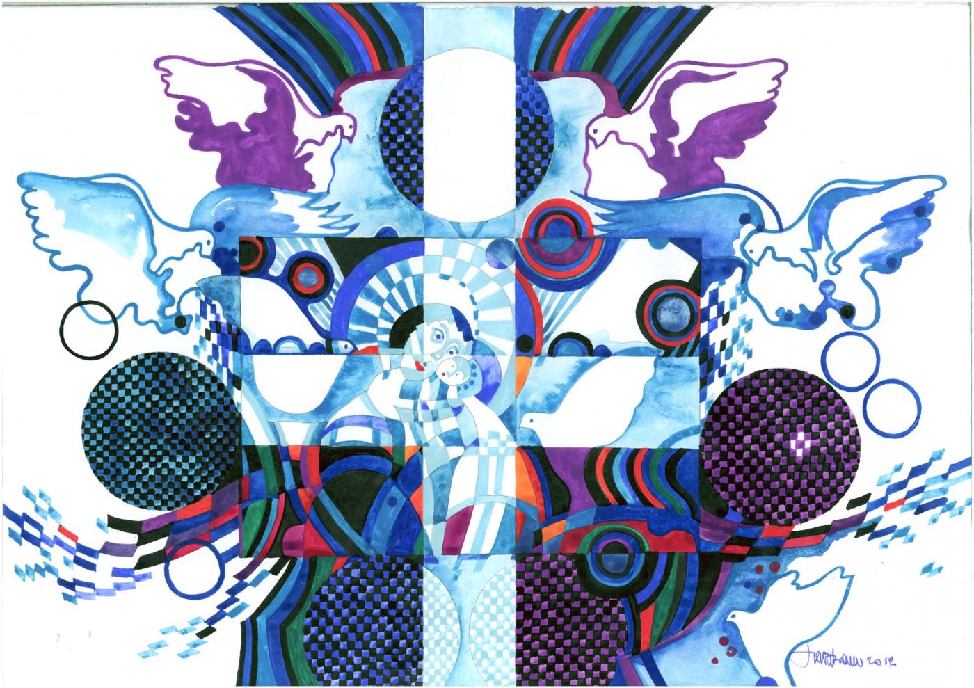 „MODERNE ANDACHTSBILDER“, Tempera auf Papier u. Drucke auf Leinen,
