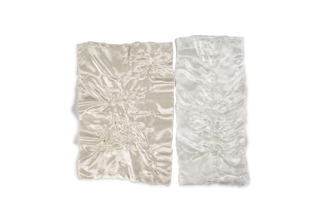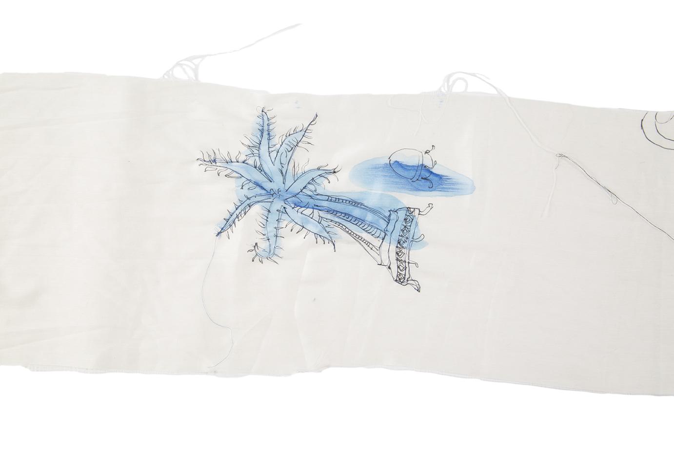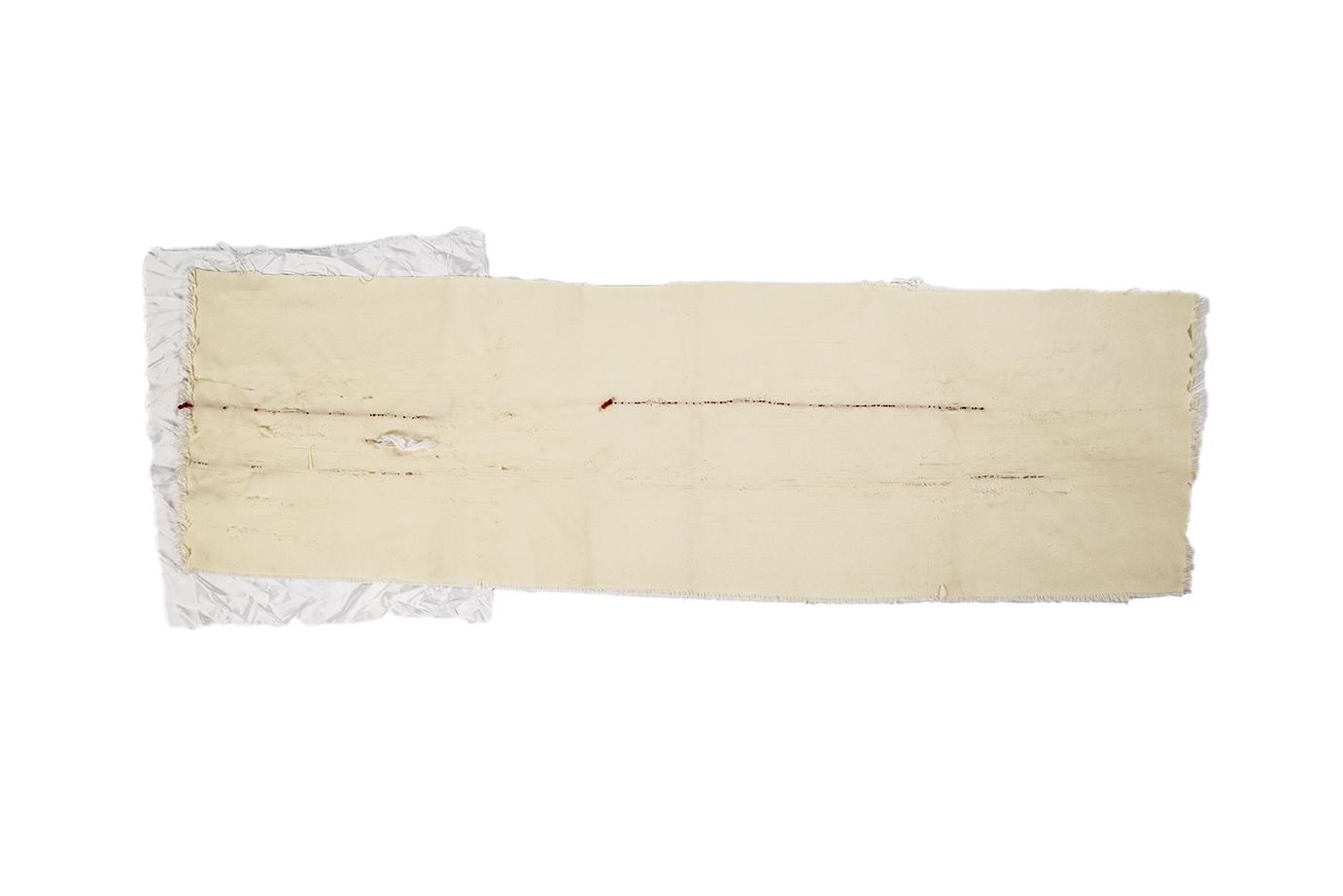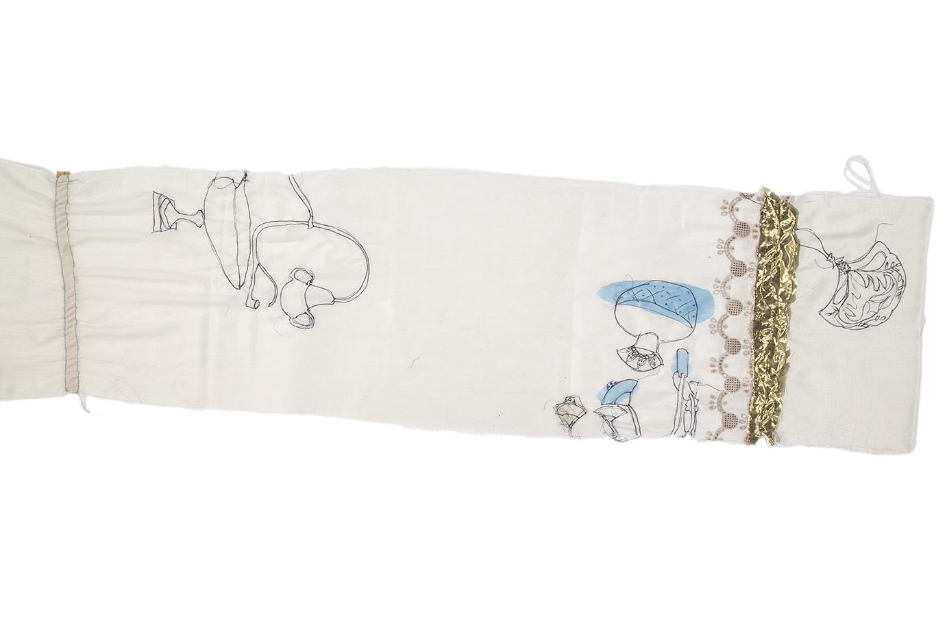 Centro della mostra è una grande installazione di teli fluttuanti che, appesi al soffitto, accoglieranno lo spettatore facendolo entrare fisicamente nell’opera d’arte. Non c’è cesura tra il lavoro di un’artista e il lavoro dell’altra, si sovrappongono e talvolta si confondono – pur rimanendo ognuno figlio di una mano precisa – come non c’è cesura nel simbolo chiave di tutta la mostra: il cerchio. Cerchio inteso come Sole e Luna, emblema di completezza e di femminilità, linea unica e continuativa, tempo infinito e infinito cammino. Morbide, fluttuanti, accoglienti, le stoffe sono state scelte dalle artiste per la loro leggerezza e poi sono state ricamate, dipinte, sfilacciate come se il tempo le avesse vissute e trasformate, ma sono anche state graffiate, bruciate, perché non ci può essere crescita, né trasformazione, né cambiamento senza un passaggio attraverso la sofferenza e la dolorosa coscienza di sé.