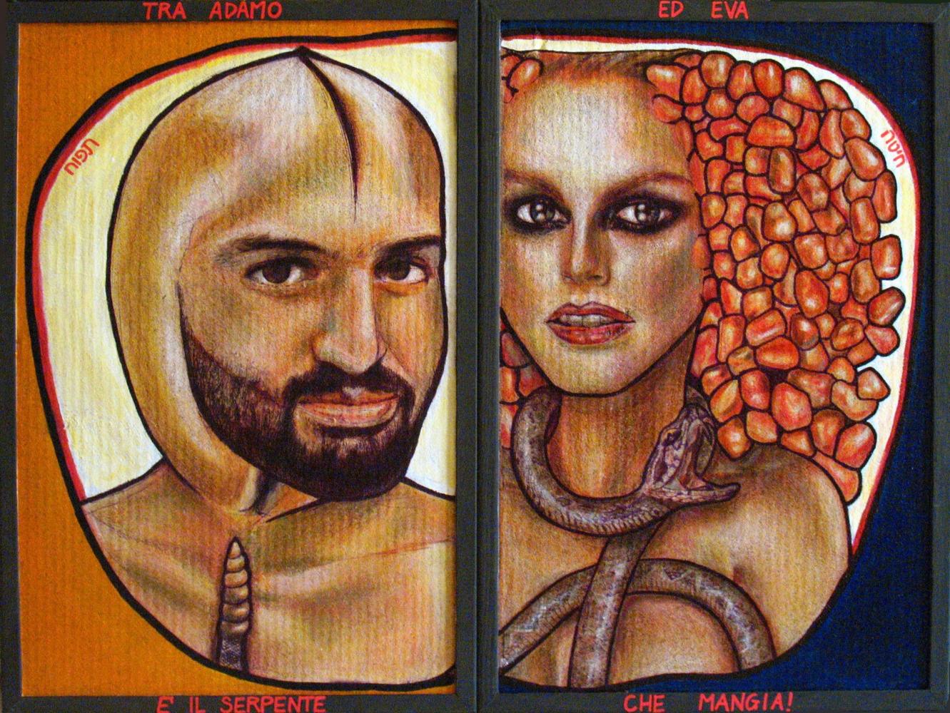 L’immagine del malato è visibile sul lato sinistro (per mezzo di una sagoma) e separata dal resto della composizione: il modo più semplice e condiviso di sostenerlo è quello di ignorarlo, di fingere che non esista, sottraendo la questione a se stessi. Il riquadro di sinistra designa una persona mentalmente instabile figurata al centro e in maniera più realistica, proprio perché essa manifesta inevitabilmente quello che è, non mostrando sovrastrutture alla propria immagine esterna ed interna. Le sagome attorno (speculari a quelle dell’altra porzione) contestano la sua collocazione possibile nella società (“esisto, anche se gli altri vivono del contrario”) e rivelano – attingendo al modello bio-psico-sociale – il condizionamento e l’incidenza che questa può produrre nel soggetto. Il colore giallo indica la stato di follia, ma è spesso associato al senso d’identità, all’Io. Il viola, suo complementare (complementarità, compresenza di opposti son elementi della mia cifra stilistica), è frequentemente riconducibile ad espressioni di forma negativa.