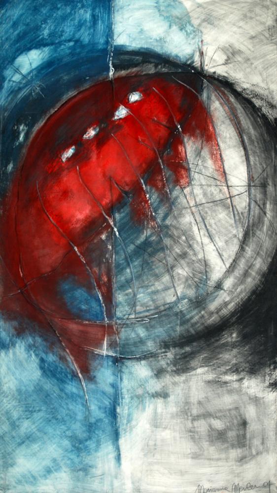 Nell’opera dal titolo “ Felicita’ ” si scorge quella corrente solcata da Marianna Merler in anni precedenti ovvero circa nel 2006 dove il dato incisivo,ovvero quello sferico e astratto erano cosi’ intensamente carichi quasi di un frastuono rutilante che voleva essere percepito, espresso.