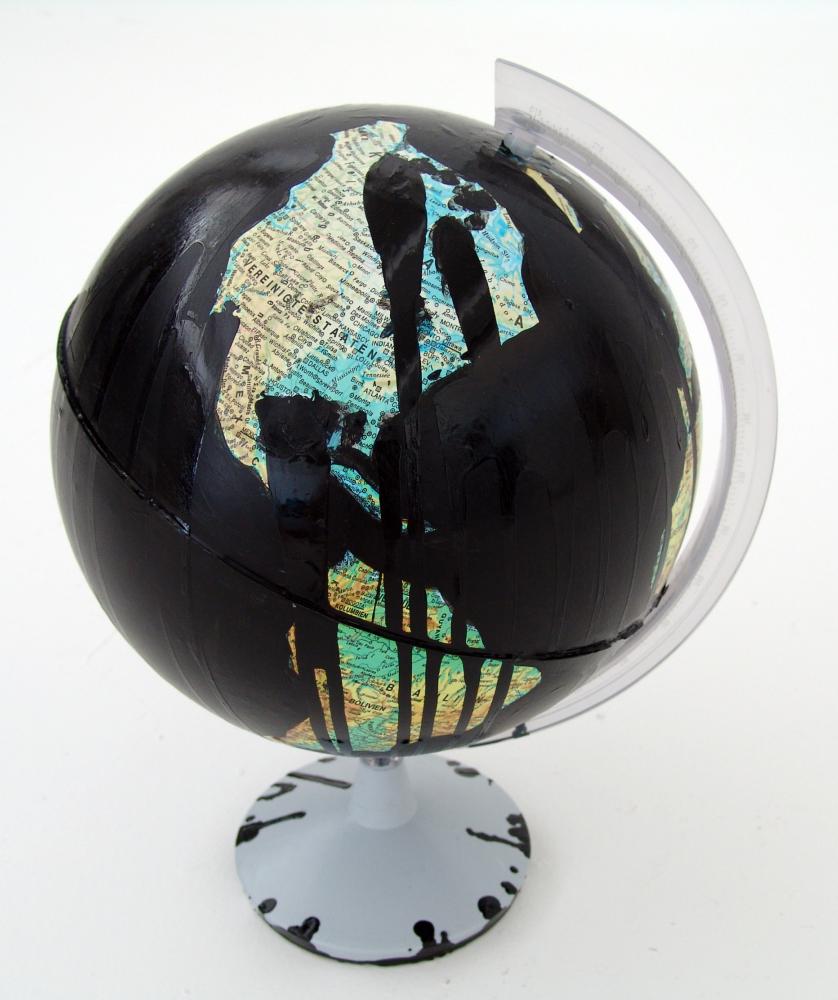 FINALISTA al Premio Rugabella 2012 con l'opera: "Disastro ambientale", tempere acriliche su mappamondo in plastica, H: 50 cm L: 30 cm P: 30 cm, 2012