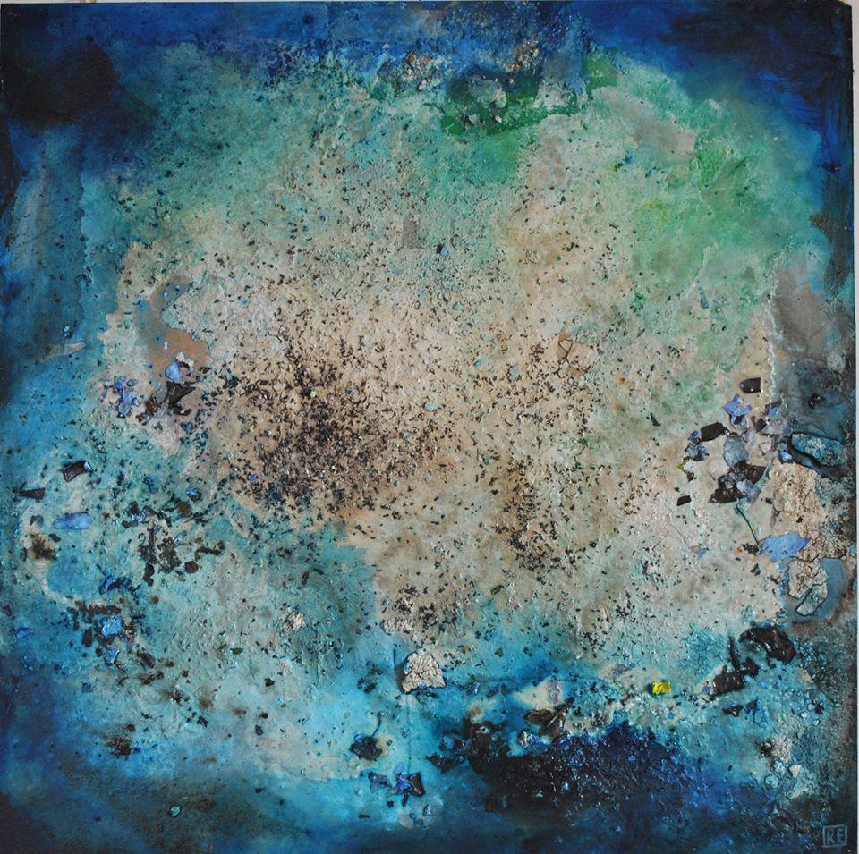 Scrive Giuseppe Morgana nel testo critico che accompagna la mostra: “… il suo intento di convogliare l’energia e allo stesso tempo farne parte è compiuto tramite l’ interazione dei colori con elementi non convenzionali quali la gommalacca, gli impregnanti o l’alcool; questa “miscela esplosiva” produce forme, figure o paesaggi “vivi” e in movimento che rievocano atmosfere e suggestioni che travolgono lo spettatore e ne stimolano la emotività. E’ come se RE fosse una sorta di “medium”, capace di fare da tramite tra l’energia insita negli elementi che usa - o stratificata da anni di uso quotidiano dei supporti utilizzati, come le vetuste finestre dismesse – e quella della nuova identità che l’opera rappresenta, carica dunque di una vita precedente ma che rinasce con il fondamentale contributo dell’artista. Le opere che ne scaturiscono sono l’esito di un attento e meditato lavoro, coerente con la poetica che contraddistingue RE e si caratterizzano per due peculiarità: armonia e movimento. Sono tutte accomunate dal “moto” dell’energia declinato su vari supporti: dalle opere su tavola come Rococò, il Grande Barry, e Misericordia al Guerriero, nelle quali l’artista sintetizza paesaggio, movimento e materia, ai vecchi infissi riadoperati per rendere visibili le “figurazioni d’energia” - riconoscibili in Poesia, Il mattino e Sibilla un giorno mi indicò le vie di casa - fino alle opere su ottone, zinco e alluminio che ben sintetizzano questa “metamorfosi dell’energia”.