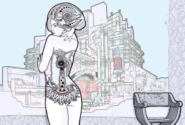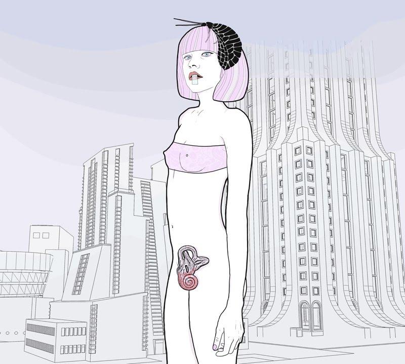 Ultimamente le protagoniste delle opere di D’Isa sembrano aver disertato il loro universo di damaschi e colori pastello di ultima generazione, per inserirsi in paesaggi modernisti. Grattacieli che ricordano la Tyrell Corporation di Blade Runner, una Lolita lotofaga dal cache-sex calcificato e spiraliforme ed un enorme scarafaggio installato nell’acconciatura, come le creature di Cronemberg.