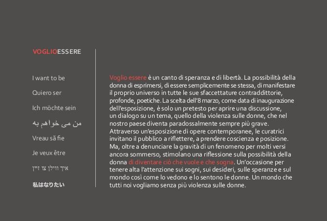“Voglio essere è un canto di speranza e di libertà” spiega Chiara Coltro che ha pensato il titolo della mostra “con queste due piccole parole in cui c'è volontà ma soprattutto il bisogno di essere, di diventare se stessi, si fa dire alla donna della sua esigenza di esprimersi, di manifestare il suo universo, in tutte le le sue sfaccettare controverse, contraddittorie, acute, profonde, magiche, poetiche”.