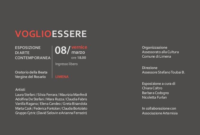 Espongono gli artisti: Laura Stefani; Silvia Ferrara; Maurizia Manfredi; Adolfina De Stefani; Mara Ruzza; Claudia Fabris; Vanilla Ragana; Elena Candeo; Greta Bisandola; Marta Czok; Federica Fontolan; Claudia Bortolato; Gruppo Cytric ( David Selovin e Arianna Ferrazin).