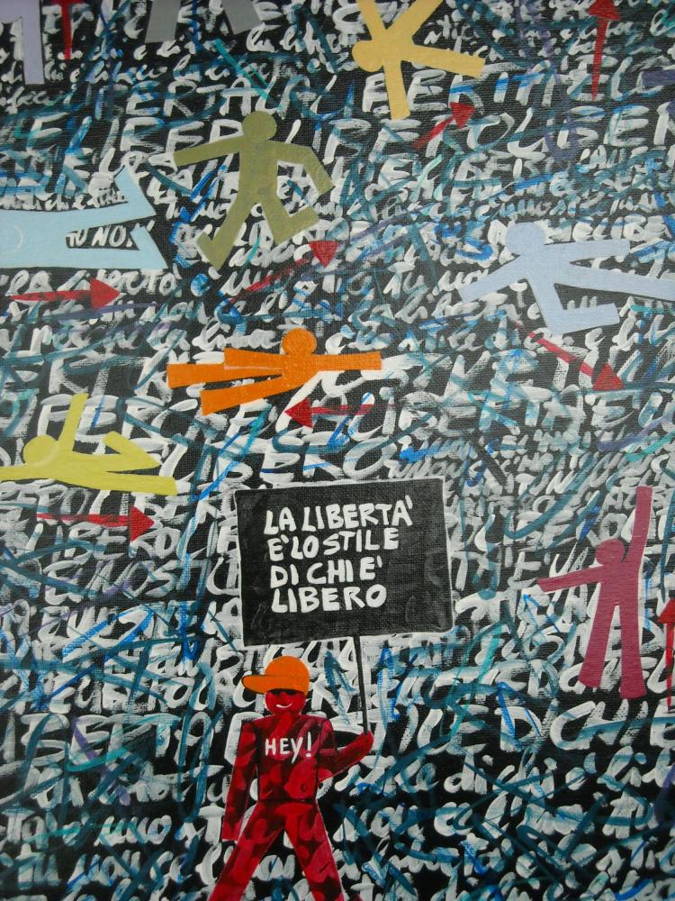 Prediligo la tela. E' come il foglio o il muro sui quali posso scrivere. La tela interagisce con me. Accolgo le sue reazioni come soluzioni compositive ai miei gesti che la stressano: graffi, scorticature, passaggi di coltelli, colori sporcati e improvvisati... Poi c'è HEY!, cioè io, che arriva sorridendo per dire cose, a volte irriverenti, che avviano una riflessione.