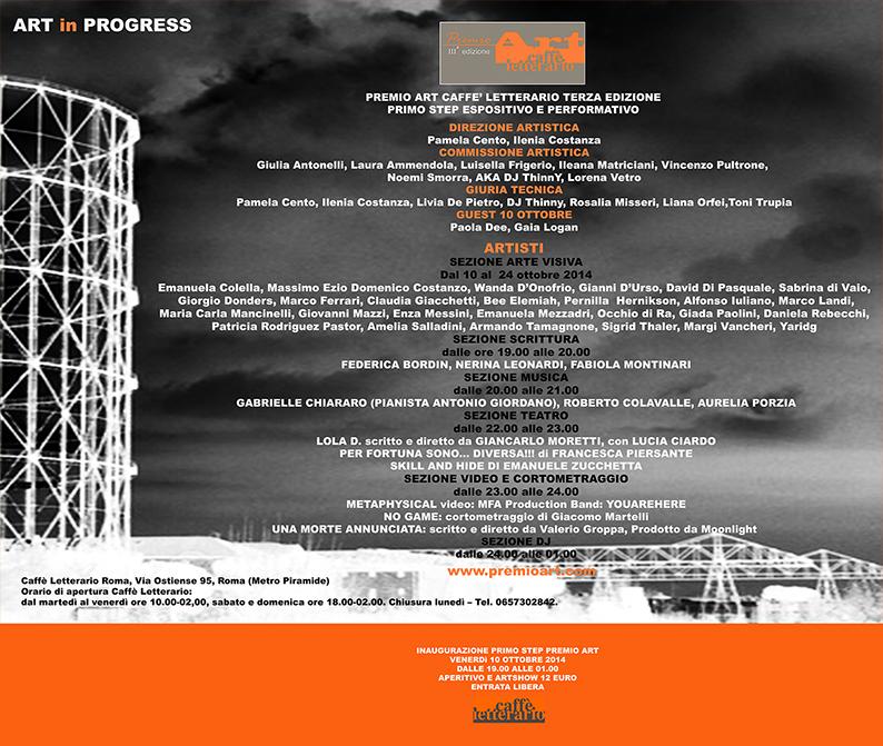 Il 10 ottobre, presso il Caffè Letterario di via Ostiense, prende avvio la Terza Edizione del Premio Art Caffè Letterario. Una vasta Esposizione di Arte Visiva che conta ventisei artisti provenienti da tutta Italia, ma anche un grande Evento Performativo in cui si confronteranno artisti delle varie discipline artistiche, in un confronto che è anche uno “con-scontro” per arrivare alla giornata finale di luglio del 1Day Premio Art in cui verrà decretato il vincitore per ognuna delle categorie artistiche. Gli artisti vengono votati sia con una votazione da parte della Giuria Tecnica, che si avvale di personalità del mondo dell’arte e dello spettacolo, sia attraverso la votazione della Giuria on-line, il pubblico infatti, dal 10 ottobre alle 19.00, può votare l’artista che ritiene più meritevole andando nella sezione Votazioni del sito www.premioart.com. In ogni serata dei cinque step del Premio Art, che si dislocheranno a cadenza bimestrale, numerosi gli Special Guest che interverranno.