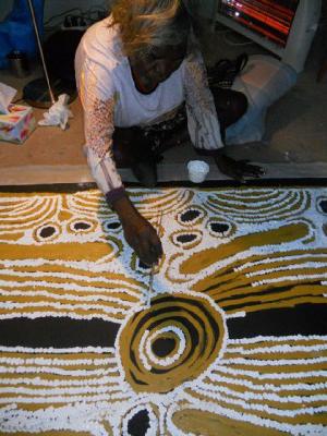 Vi sono, certo, evidenti affinità con l’arte moderna di cui ricorda molte scuole, ma è sempre libera. La stessa libertà che caratterizza la vita e la cultura degli aborigeni, senza confini e recinzioni, ma legate alla terra di origine in puro senso spirituale. Ed è soprattutto di spiritualità che è permeata quest’arte che si tramanda da almeno 40.000 anni e che esprime una riconoscente devozione alla Creazione della Terra. Arte tribale e mondo spirituale si fondono in un cromatismo espressivo e simbolico che si dirama in diversi stili. Spesso caratterizzate da puntini (dot art), le immagini sembrano formate da miliardi di stelle che, uniti fantasticamente fra loro, offrono forme sconosciute ed enigmatiche; ma possono sembrare anche la traduzione pittorica di disegni formati dalle gocce di pioggia impresse sul terreno arido del deserto australiano, un gesto per rendere omaggio alla madre della vita, l’acqua; in ogni caso si ottiene un ricamo attento e raffinato, eseguito con eleganza e minuziosità, sintetico ed essenziale al tempo stesso.