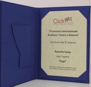 Sabato 12 marzo alle ore 18,00 è stata presentata a Cormano, presso la sede del Centro Culturale Artistico Click Art, la 3° mostra concorso di pittura Colore e Materia che ha visto la partecipazione di tantissima gente. Durante il vernissage c'è stata la cerimonia di premiazione che ha visto l'artista Assunta Cassa aggiudicarsi il Terzo Premio Ex Aequo per la sua opera "Fuga" con la quale ha partecipato al Concorso.