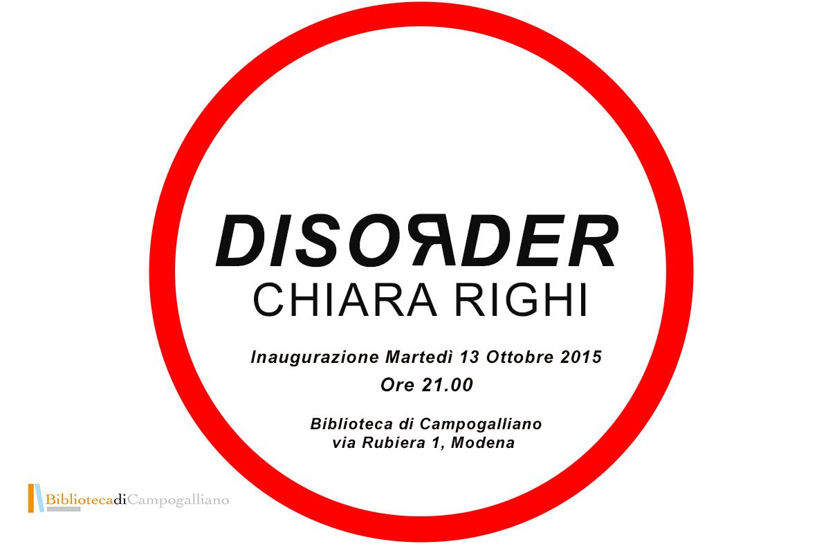 La mostra Disorder è stata concepita in occasione delle serate "Giallo e Dintorni" per la biblioteca di Campogalliano, Modena. L'inaugurazione avverrà in concomitanza con la prima presentazione del libro "La poltrona vuota" di Raffaella Bosi, per cui ho realizzato la copertina. Animeranno la serata l'attore Simone Maretti, la musica di Lisa Bravaglieri e Patty Valle.