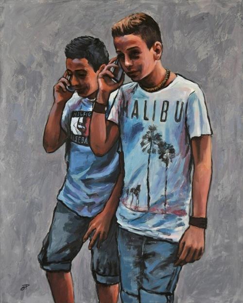In esposizione, una ventina di opere ad acrilico su tela realizzate nel 2013-2014. Dipinti accomunati dalla presenza di singoli individui, coppie e gruppi di ragazzi, vicini e allo stesso tempo lontani, tra connessione, solitudine e dipendenza.