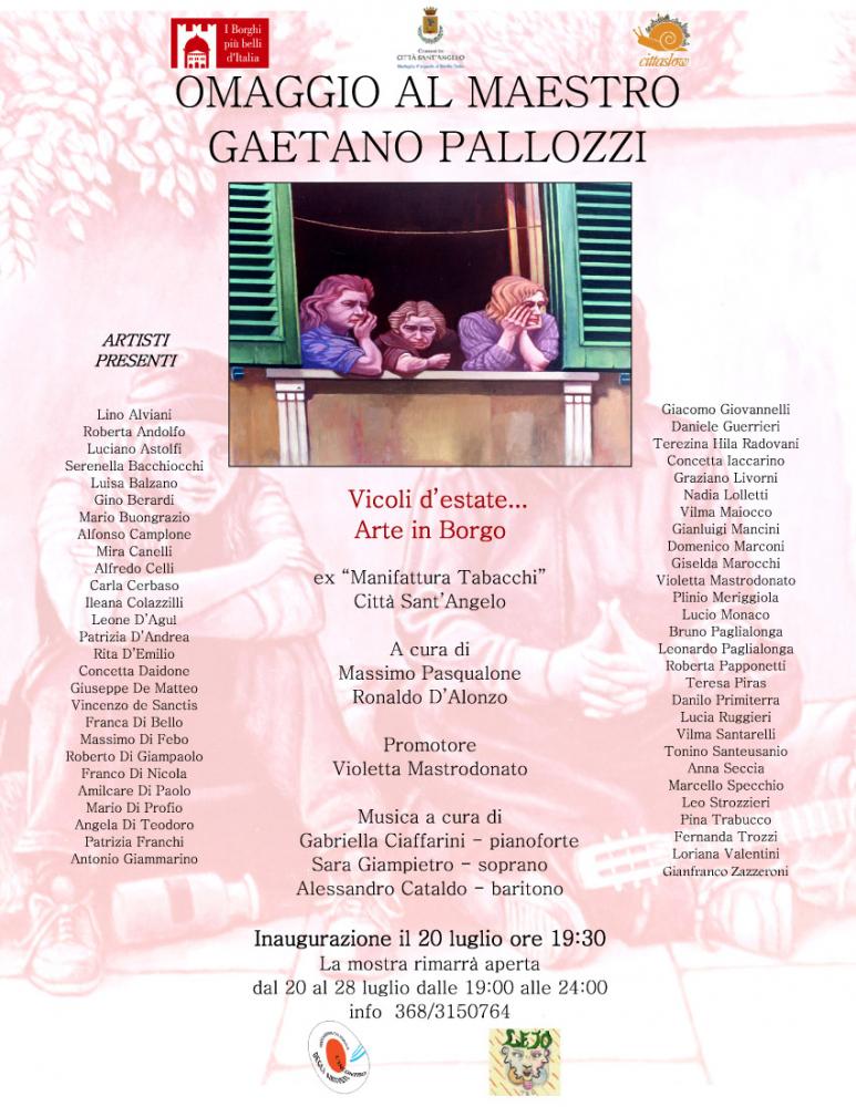“Cosa c’è di più prezioso da poter aggiungere alla bellezza se non un sentimento d’amore, un sentimento d’amicizia? Ma l’amicizia più che l’amore può conferire al dono lo splendore della riconoscenza, la vivezza e il trasporto di una passione condivisa. L’aver ideato una mostra collettiva che abbia come punto di riferimento l’amicizia tra artisti è un’iniziativa insolita e lodevole. Perché di questi tempi tale sentimento si è del tutto rarefatto, non solo nell’ambito artistico e intellettuale, ma anche negli animi delle persone comuni. E’ anche un confortante segnale quello di voler raccogliere attorno all’opera di un Maestro le testimonianze e i contributi degli amici, i quali, anche se seguono differenti percorsi di ricerca, scegliendo a volte soluzioni stilistiche opposte, mostrano pur tuttavia, con la loro entusiastica adesione, come sia davvero “fondante” e ineludibile per le arti il procedere assieme nella verifica, nel confronto e nella comprensione reciproca. Il colore, in questa prospettiva di riproduzioni, si fa dunque sentimento e storia, prezioso elemento di un’estetica rinnovata sul versante del lavoro e della collaborazione, dove centro di riferimento è Gaetano Pallozzi …” - Rolando D’Alonzo