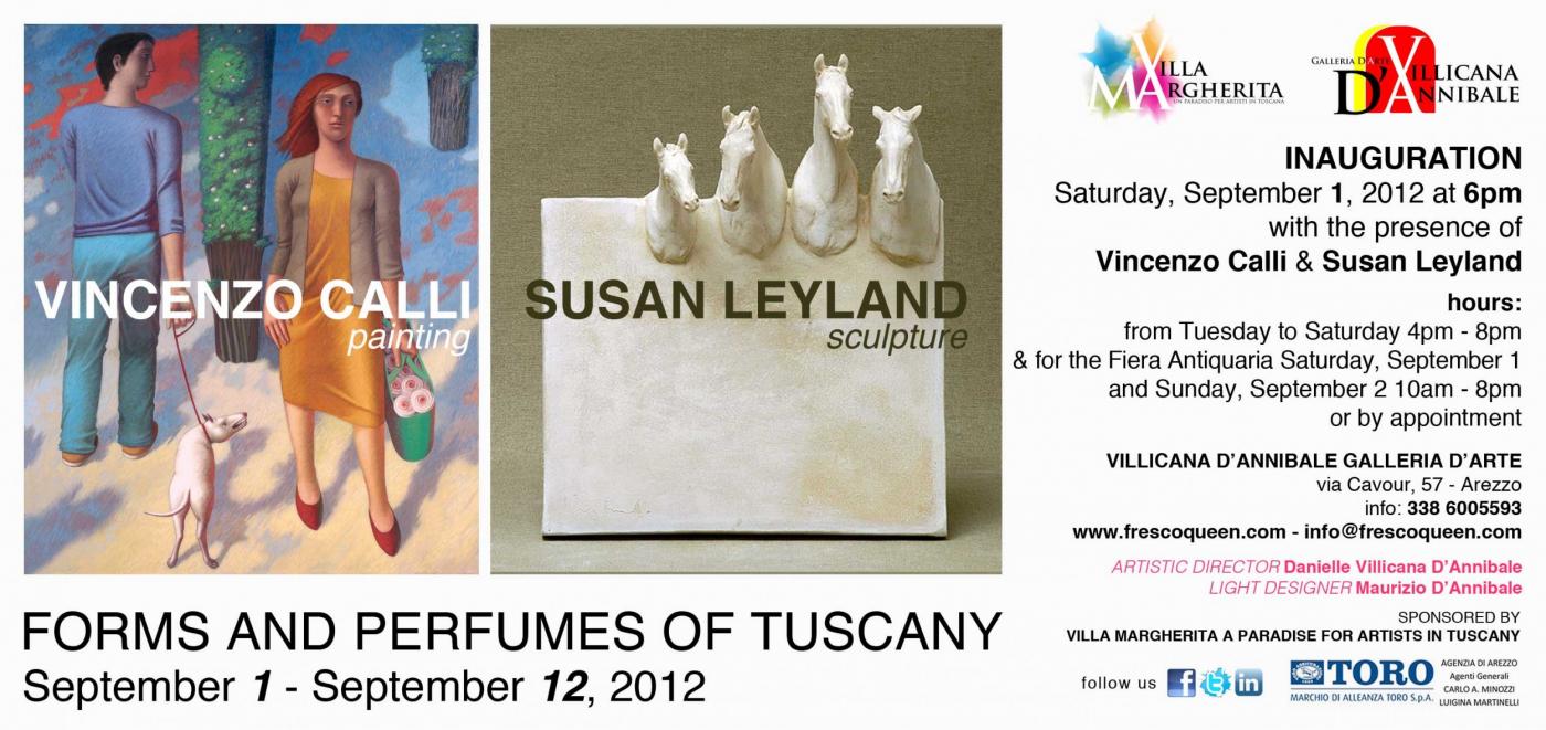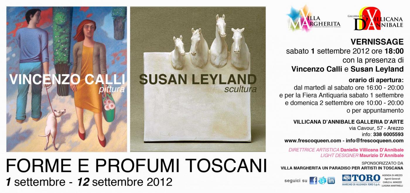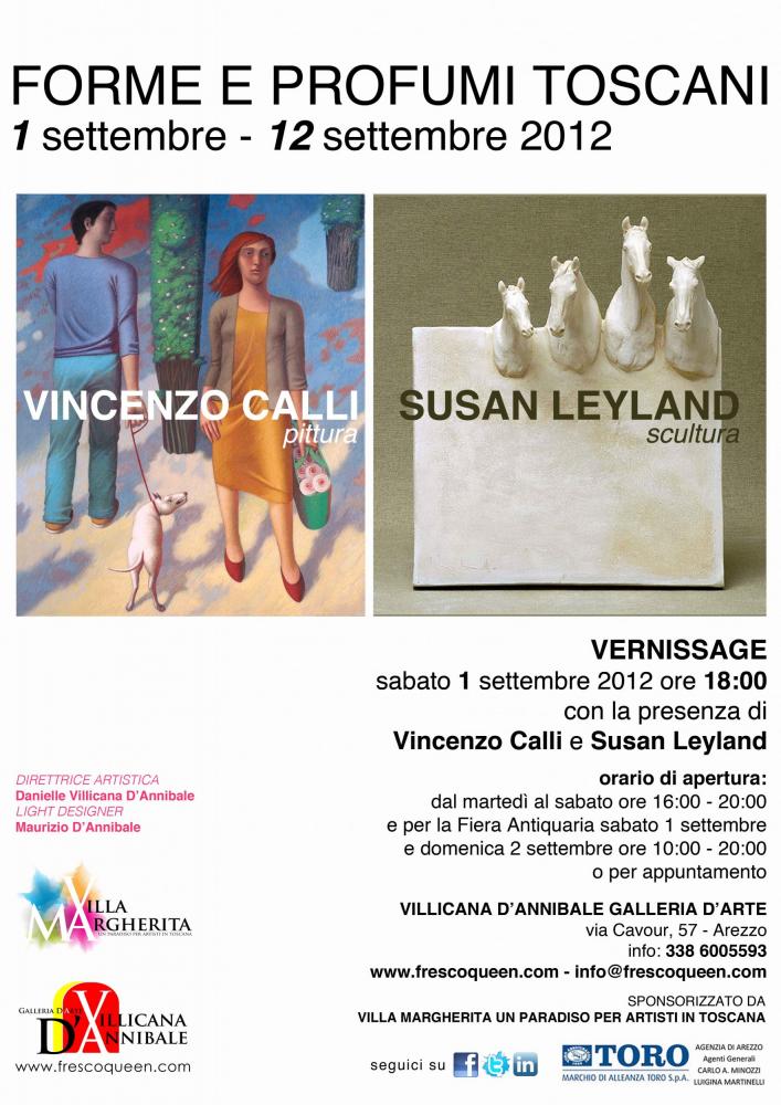 Sabato 1 settembre 2012, alle ore 18, alla Villicana D’Annibale Galleria D’Arte di via Cavour (Arezzo) si inaugura la mostra di pittura e scultura di Vincenzo Calli e Susan Leyland dal titolo Forme e Profumi Toscani. L’esposizione, a cura della gallerista e artista californiana Danielle Villicana D’Annibale, ospiterà una selezione di opere del pittore aretino e della scultrice inglese. La mostra proseguirà, a ingresso gratuito, fino a mercoledì 12 settembre 2012.