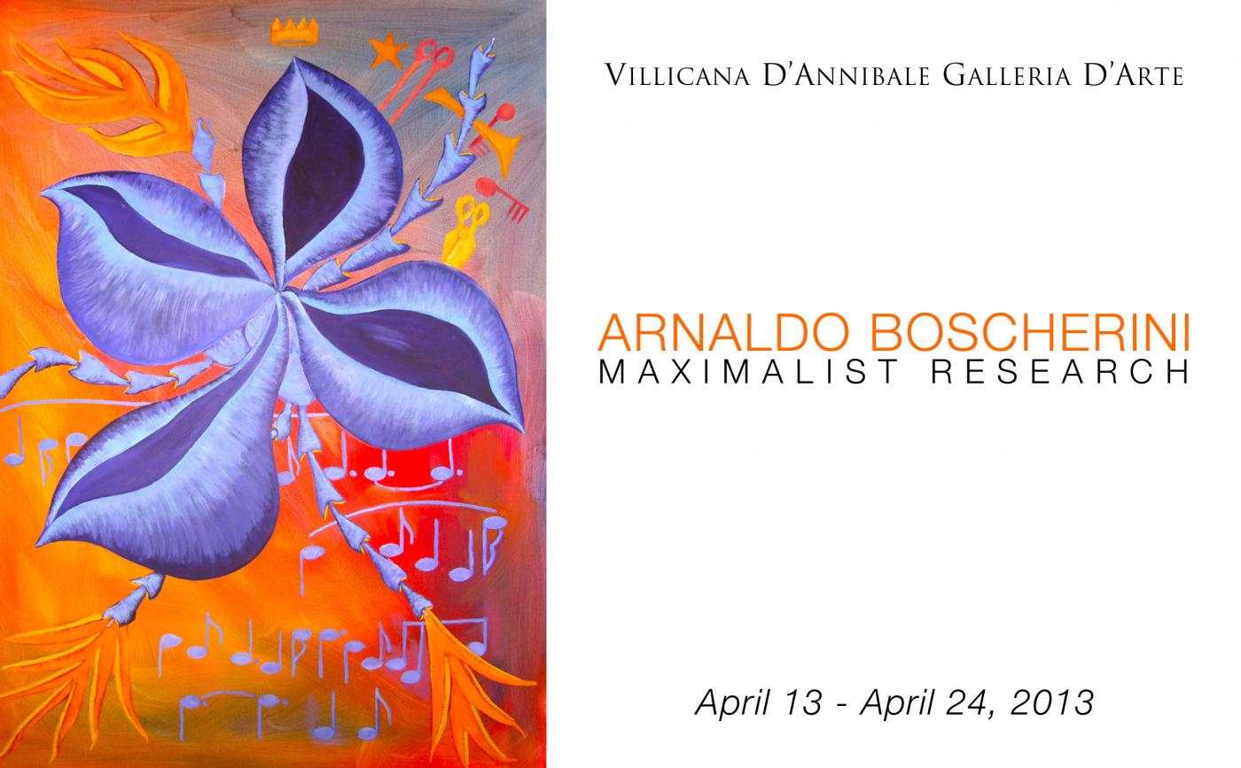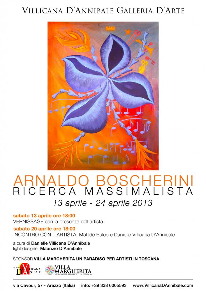 Sabato 13 aprile 2013, alle ore 18, alla Villicana D’Annibale Galleria D’Arte di via Cavour 57, ad Arezzo, si inaugura la mostra di pittura di Arnaldo Boscherini dal titolo Ricerca Massimalista. L’esposizione, a cura dell’artista e direttrice della galleria Danielle Villicana D’Annibale, ospiterà una selezione di opere recenti dell’artista italoamericano. La mostra proseguirà, a ingresso gratuito, fino a mercoledì 24 aprile 2013.