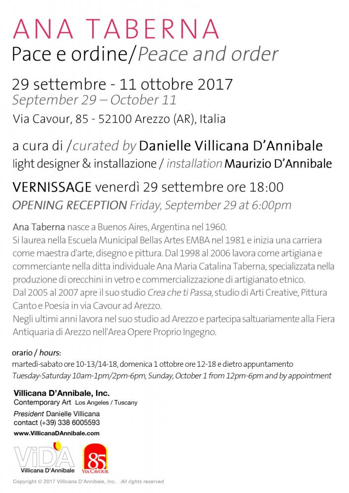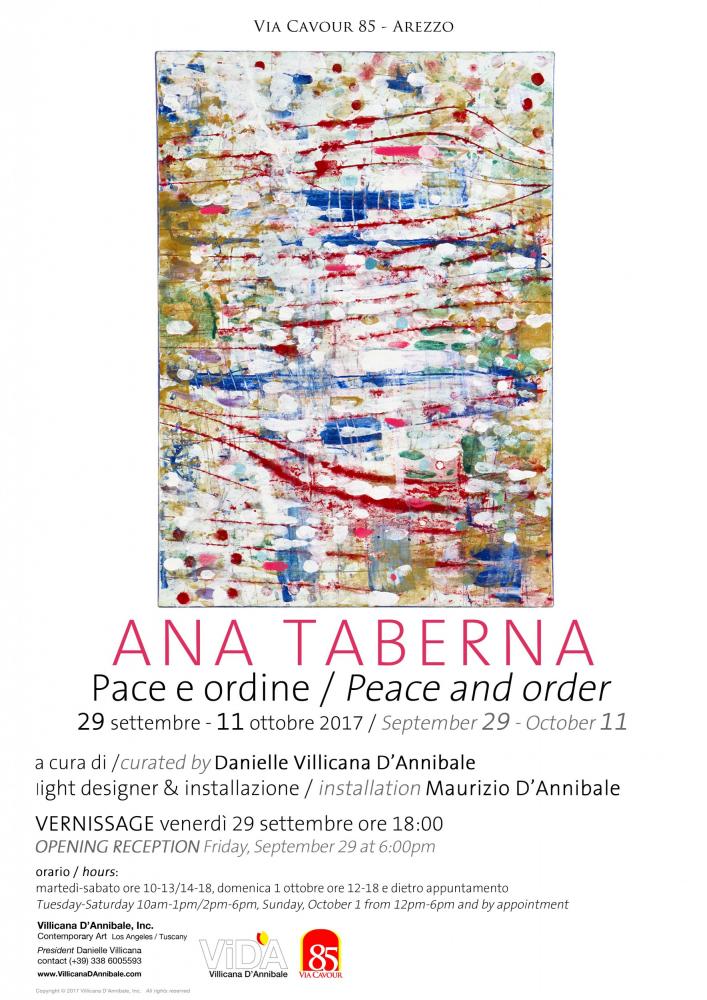 Siamo lieti di presentare Ana Taberna per una mostra personale che illustra una selezione dei suoi dipinti recenti di genere astratto e colorato. “Ana Taberna: Pace e Ordine”, a cura di Danielle Villicana D’Annibale, in collaborazione con Maurizio D’Annibale, avrà durata dal 29 settembre al 11 ottobre 2017. In occasione del vernissage sarà presente l’artista. La mostra sarà svolta a Via Cavour 85, 52100 Arezzo (AR), Italia ed è organizzato da Villicana D'Annibale, Inc.