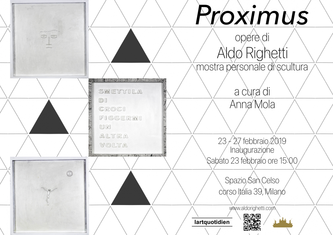 La scultura modulare presente sulla locandina: “Christus”, è stata scelta perché rappresenta un nuovo passaggio nella ricerca artistica e personale di Aldo. È infatti la prima opera in cui compaiono delle parole. Pochissime ma ci danno una chiave lettura: una figura Christi ritornata sulla Terra, ma solo per essere di nuovo brutalizzata, fino quasi a scomparire nel sostrato. E quel “tu” così diretto non può lasciare indifferenti.