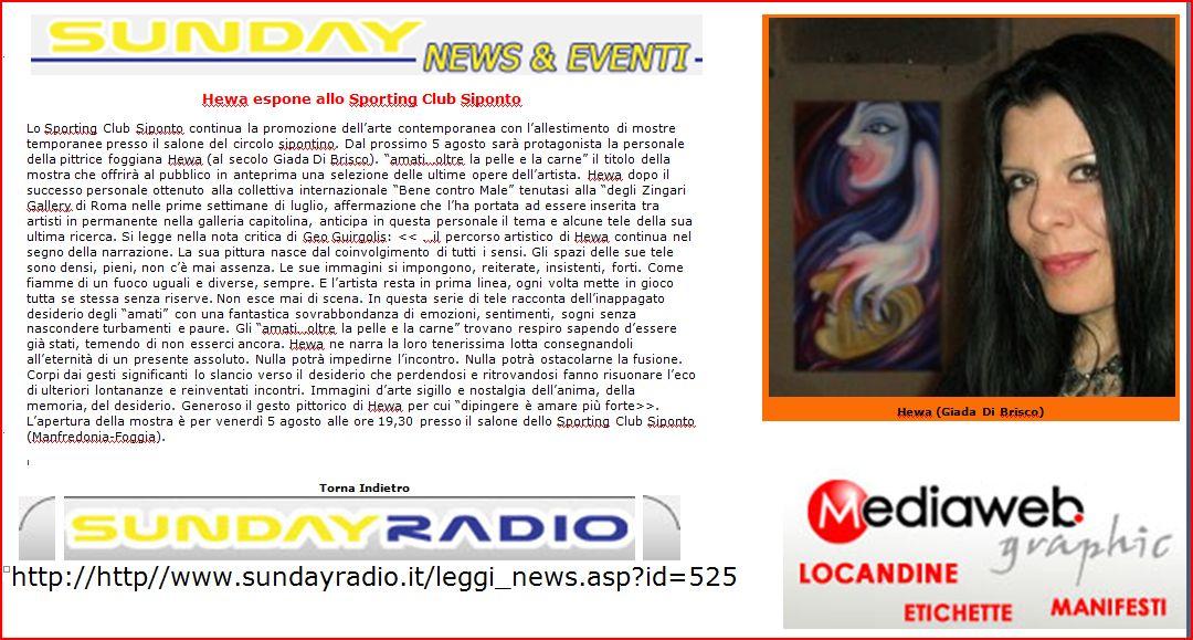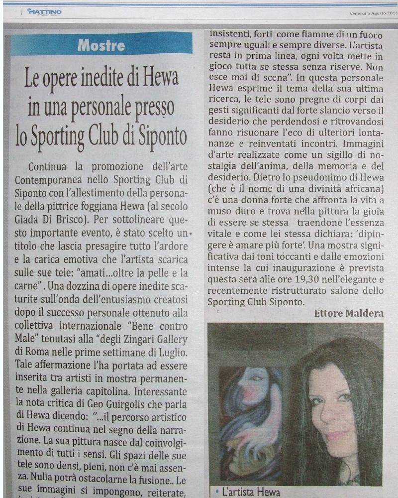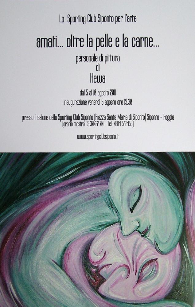Lo Sporting Club Siponto continua la promozione dell’arte contemporanea con l’allestimento di mostre temporanee presso il salone del circolo sipontino. Dal prossimo 5 agosto sarà protagonista la personale della pittrice foggiana Hewa (al secolo Giada Di Brisco). “amati…oltre la pelle e la carne” il titolo della mostra che offrirà al pubblico in anteprima una selezione delle ultime opere dell’artista. Hewa dopo il successo personale ottenuto alla collettiva internazionale “Bene contro Male” tenutasi alla “degli Zingari Gallery di Roma nelle prime settimane di luglio, affermazione che l’ha portata ad essere inserita tra artisti in permanente nella galleria capitolina, anticipa in questa personale il tema e alcune tele della sua ultima ricerca. Si legge nella nota critica di Geo Guirgolis: << …il percorso artistico di Hewa continua nel segno della narrazione. La sua pittura nasce dal coinvolgimento di tutti i sensi. Gli spazi delle sue tele sono densi, pieni, non c’è mai assenza. Le sue immagini si impongono, reiterate, insistenti, forti. Come fiamme di un fuoco uguali e diverse, sempre. E l’artista resta in prima linea, ogni volta mette in gioco tutta se stessa senza riserve. Non esce mai di scena. In questa serie di tele racconta dell’inappagato desiderio degli “amati” con una fantastica sovrabbondanza di emozioni, sentimenti, sogni senza nascondere turbamenti e paure. Gli “amati…oltre la pelle e la carne” trovano respiro sapendo d’essere già stati, temendo di non esserci ancora. Hewa ne narra la loro tenerissima lotta consegnandoli all’eternità di un presente assoluto. Nulla potrà impedirne l’incontro. Nulla potrà ostacolarne la fusione. Corpi dai gesti significanti lo slancio verso il desiderio che perdendosi e ritrovandosi fanno risuonare l’eco di ulteriori lontananze e reinventati incontri. Immagini d’arte sigillo e nostalgia dell’anima, della memoria, del desiderio. Generoso il gesto pittorico di Hewa per cui “dipingere è amare più forte>>. L’apertura della mostra è per venerdì 5 agosto alle ore 19,30 presso il salone dello Sporting Club Siponto (Manfredonia-Foggia).