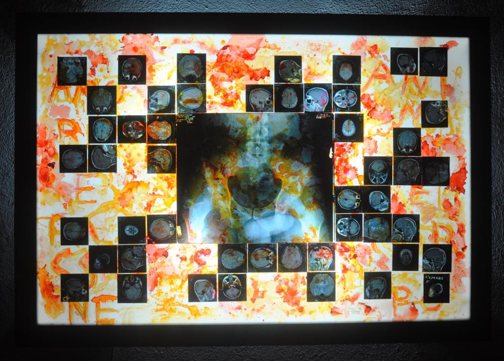 Una particolare installazione ci permette di comprendere l'immensità che si riscontra nell'osservare l'essere umano dall'interno.Il lavoro di Angelo Frabasile è un interessante rebus di come, per mezzo di negativi e radiografie, riusciamo a leggere dentro noi stessi.Lettere sparse e colorate sono distribuite sulla superficie del supporto che, dall'interno, è illuminato con una particolare luce. Negativoscopio si pone, a mio avviso, in una nuova ottica di introspezione anatomica: il cervello più volte sezionato e ribaltato modularmente, come un puzzle, costruisce un complesso discorso narrativo.Il principio della vivisezione di tipo leornardesco viene ad assumere, grazie all'artista, una sfumatura di tipo etico e comportamentale. Esistono molti problemi sull'identificazione del soggetto raffigurato e, quindi, sulla possibilità di leggerlo introspettivamente. Infine, Angelo Frabasile sembra voler coniugare il corpo con la mente, così come è osservabile nell'opera di Robert Rauuschenberg dal titolo "Untitled, double Rauschenberg".