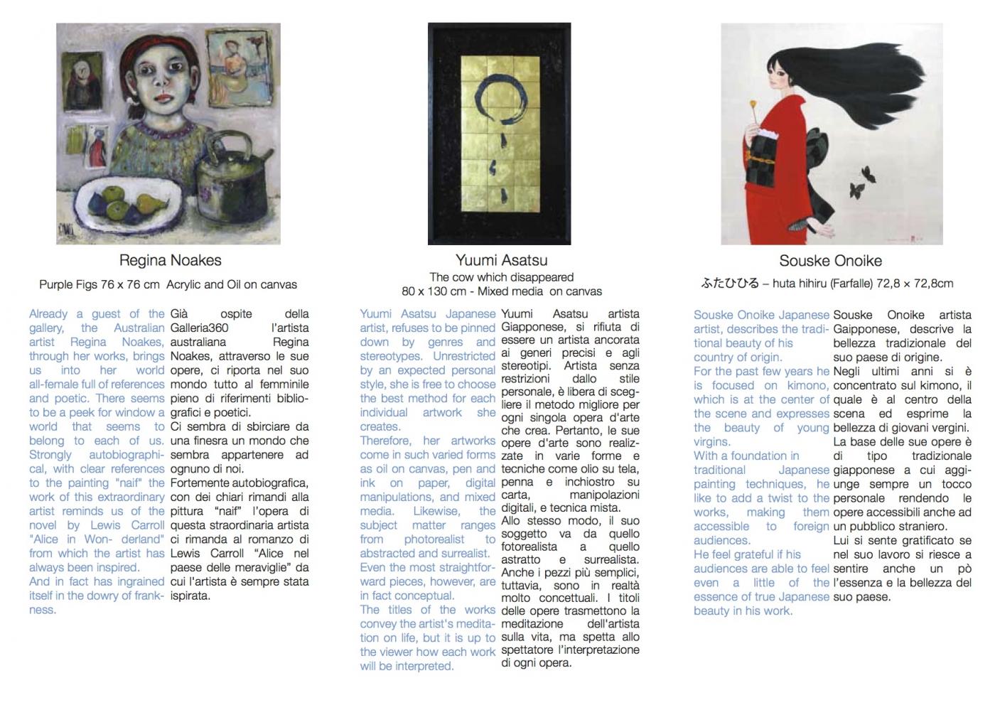 Arte giapponese a confronto con le opere di Souske Onoike il quale descrive la bellezza del suo paese mediante ritratti di giovani donne con abiti tradizionali e Yuumi Asatsu Artista senza restrizioni dallo stile concettuale, le sue opere d'arte sono realizzate in varie forme e tecniche così come i soggetti ripresi che vanno da quelli fotorealisti a quelli astratti e surrealisti.