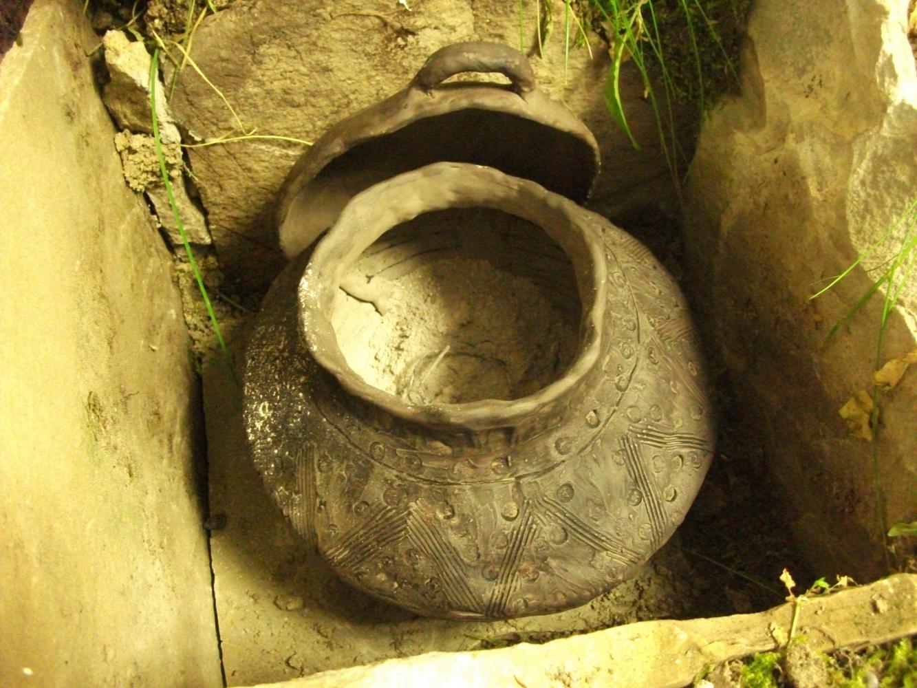 L’urna cineraria veniva poi inserita in una semplice tomba realizzata con sei lastre di pietra, una sul fondo dello scavo, quattro laterali e l’ultima in sommità che fungeva da copertura.