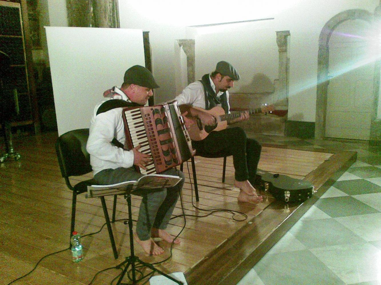Reduci dal loro ultimissimo lavoro “In Milonga” uscito i primi di ottobre, Sasà Calabrese (chitarra/basso) e Salvatore Cauteruccio (fisarmonica), ci proporranno una rivisitazione in chiave acustica dei più noti brani classici di tango, vals e milonga con brevi incursioni di tango elettronico. Note musicali cariche di colore, intensità e passione.