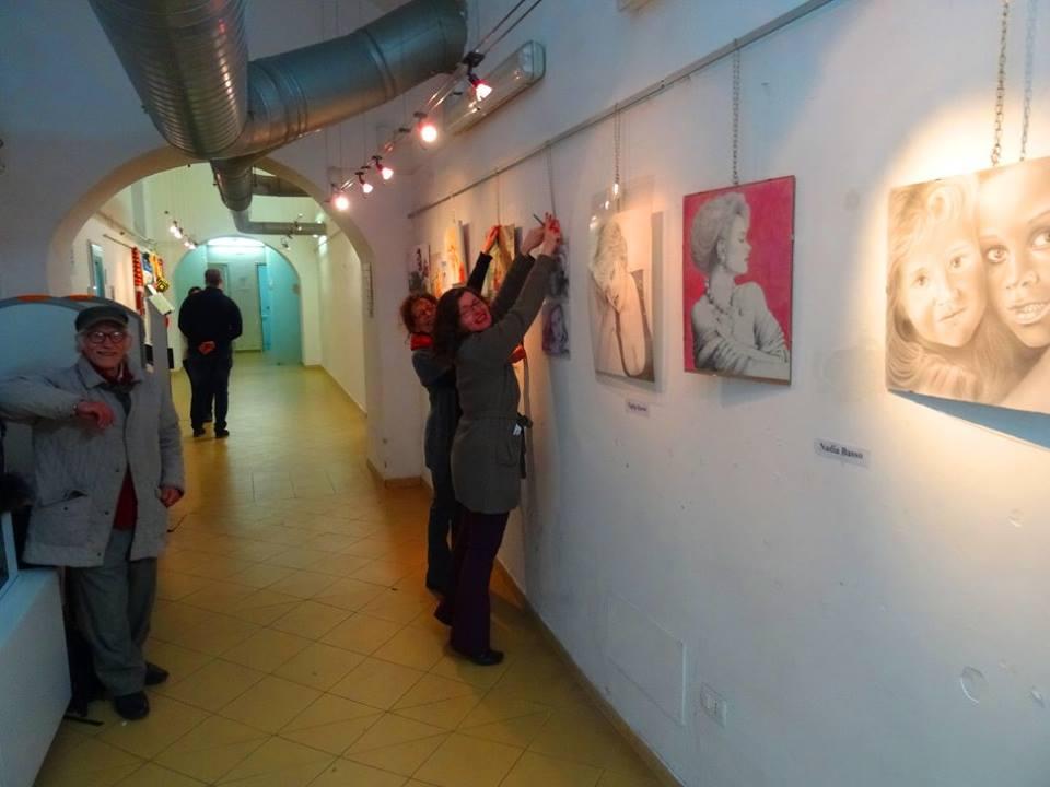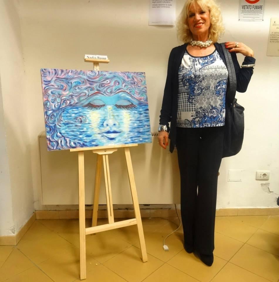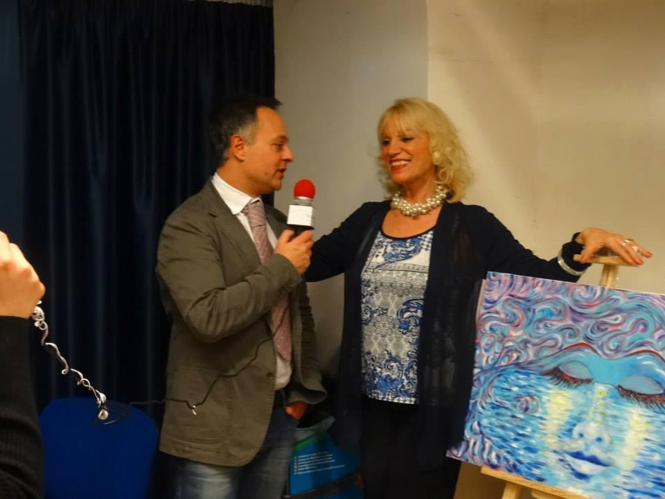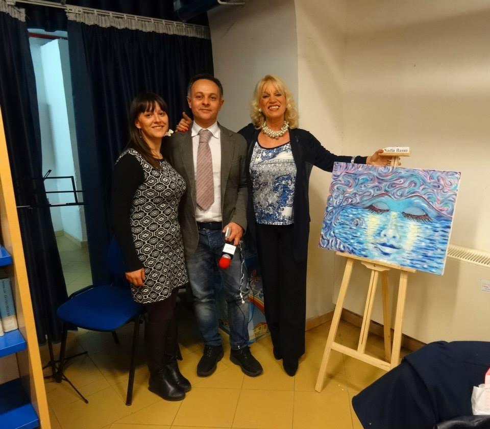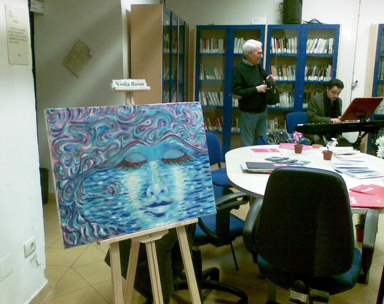 Tanti, tantissimi flash ad immortalare ogni momento del pomeriggio trascorso tra quadri, manufatti, poesie, musica e racconti, in un clima rilassato, giocoso e familiare, dove ciascuno si è sentito libero di esprimere il suo punto di vista sulle donne. Numerosi i dipinti esposti nella galleria, dove si è svolta la prima parte del “salotto”; tra gli espositori: le sorelle Viscione (Valeria e Sara) e Nadia Basso, che ci ha presentato la sua opera dedicata al Vesuvio. Nel dipinto, il “gigante addormentato” assume le sembianze di una donna assopita sulle calme onde del mare, ma allo stesso tempo, pronta a risvegliarsi con tutta l’energia delle sue fiamme. Ascoltiamo a tal proposito le parole della pittrice:
