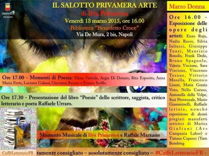 Di pregio anche i manufatti artistici di Marisa Giuliani (Ars Campania Labor), che ha esposto i suoi preziosi merletti e di Tiziana Capasso che ha deliziato la vista con i suoi filati, quelli di Yarn Bombing, che hanno letteralmente invaso il Vomero, decorandolo con vivacità, nei mesi scorsi. Con precisione svizzera Ilva Primavera dà inizio alla seconda parte del salotto culturale presentando di volta in volta i suoi ospiti, accolti con affetto ed applausi. Sicuramente da sottolineare gli interventi di Argia di Donato ed Elena Varriale, che hanno recitato le loro composizioni dedicate alle dee, la lettura di uno scritto di Madre Teresa di Calcutta sulle donne, da parte di Anna Maria Forte, e il commosso intervento dello scrittore, saggista, critico letterario e poeta Raffaele Urraro, che ha letto alcuni brani e poesie tratti da suoi libri (che hanno ricondotto la memoria agli anni del dopoguerra), nonché l’esibizione finale della padrona di casa. Ascoltiamo alcuni dei versi che sono stati decantati per l'occasione: