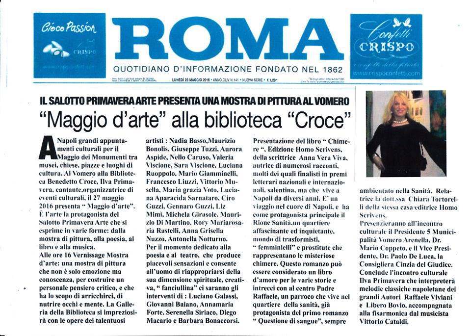 alle ore 16 Mostra d'arte degli artisti : :Nadia Basso,Maurizio Bonolis, Giuseppe Tuzzi, Aurora Aspide,Nello Caruso, Valeria Viscione, Sara Viscione, Luciana Ruoppolo, Mario Giamminelli, Francesco Liuzzi, Vittorio Musella, Maria grazia Voto, Luciana Aracida Sarnataro, Ciro Guzzi, Gennaro Guzzi, Liz Mimì, Michela Girasole, Maurizio Di Martino, Anna Grisabella Nuzzo , Sachjot KaurNotturno Antonella , che con i loro dipinti impreziosiscono la galleria della Biblioteca, opere d’arte dove si cattura il movimento che scaturisce dall'energia racchiusa in tutti noi che amiamo l'arte, come un'anima che vibra nella luce e dà continuità al messaggio della memoria.